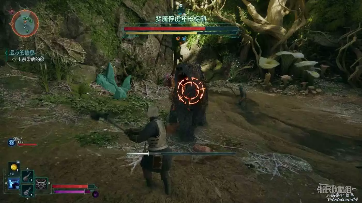 在下圖標識1處可以看到敵人的紅色血條與黃色恐慌條,玩家攻擊敵人會積累恐慌條,等恐慌條積滿會觸發敵人的短暫僵直,這時上前攻擊敵人可造成大量傷害。