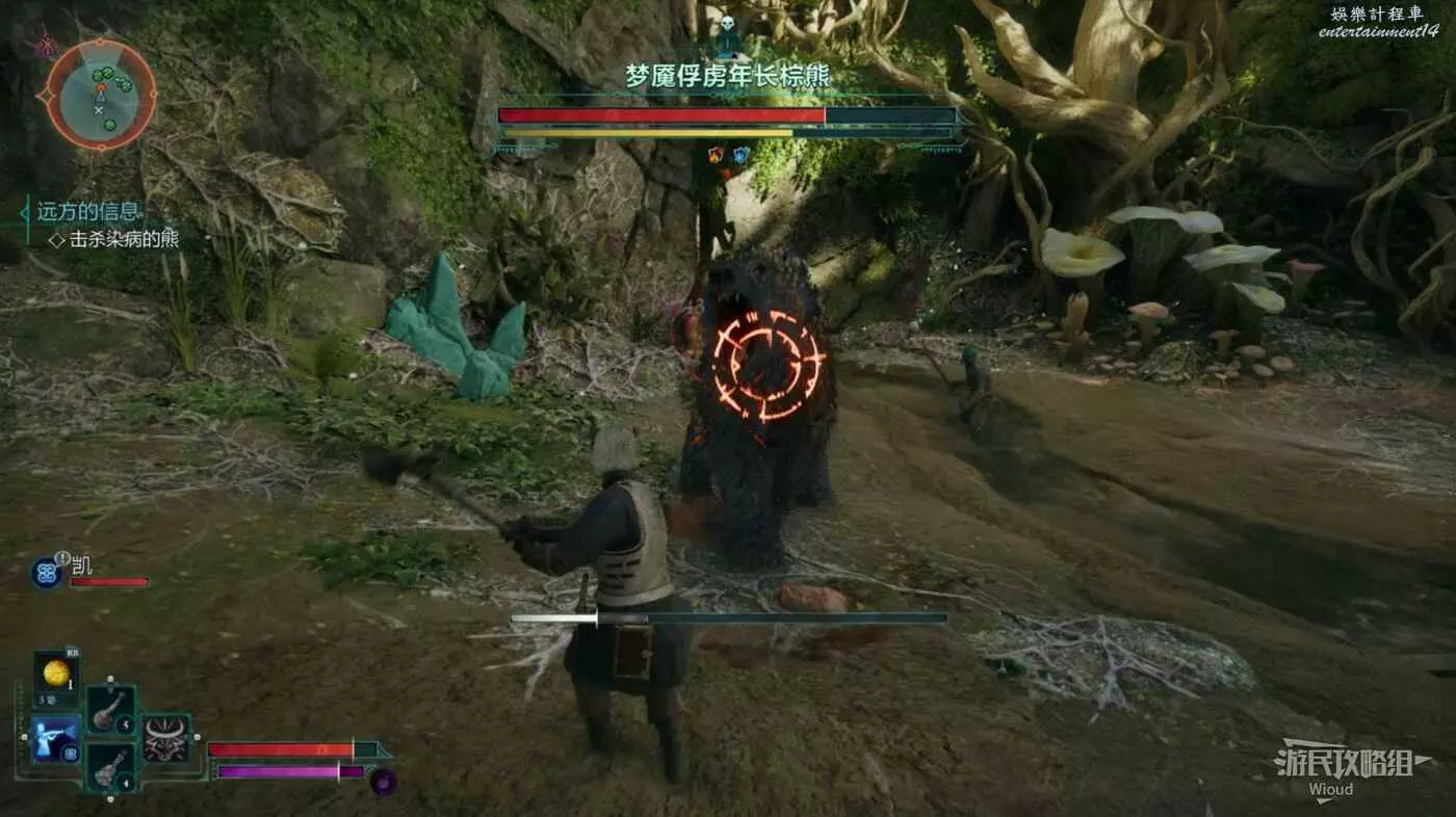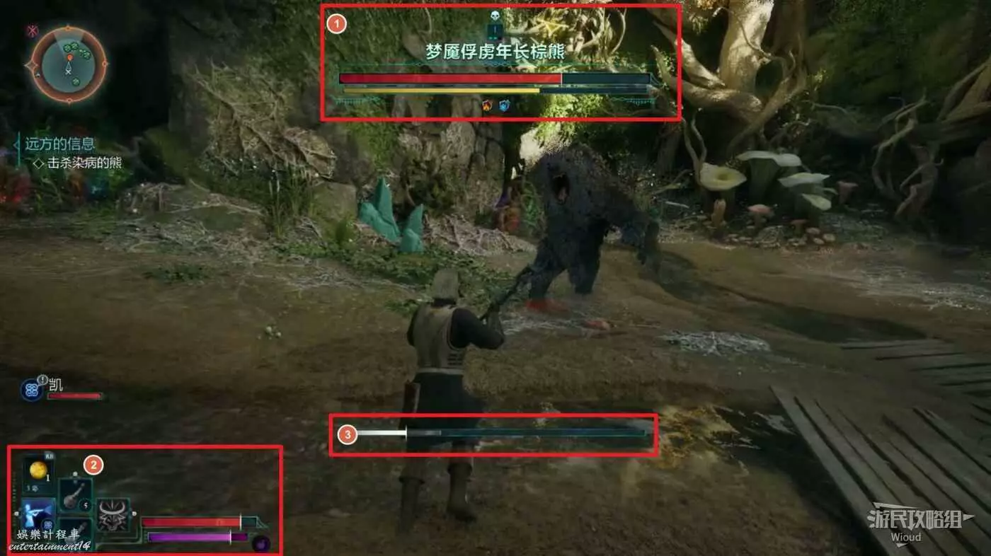 在下圖標識1處可以看到敵人的紅色血條與黃色恐慌條,玩家攻擊敵人會積累恐慌條,等恐慌條積滿會觸發敵人的短暫僵直,這時上前攻擊敵人可造成大量傷害。