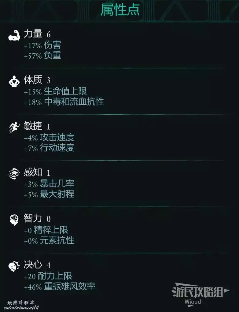 玩家角色的主要屬性為力量、體質、敏捷、感知、智力和決心等六個維度。