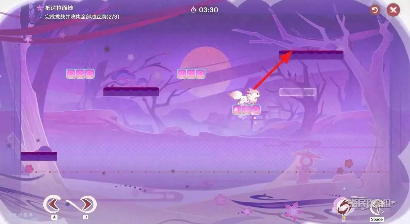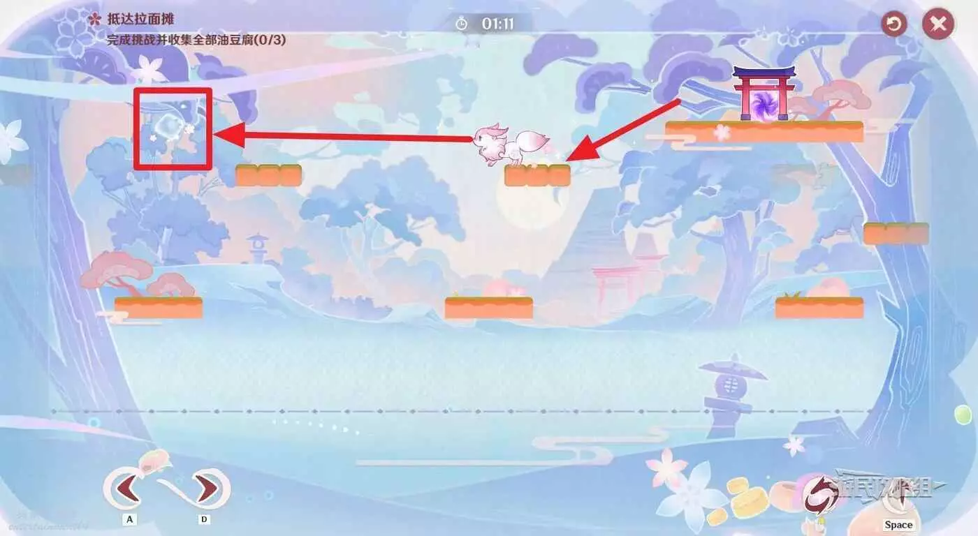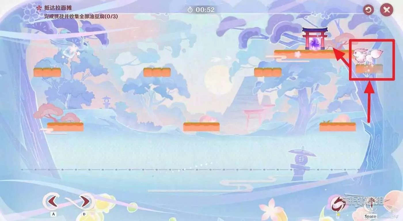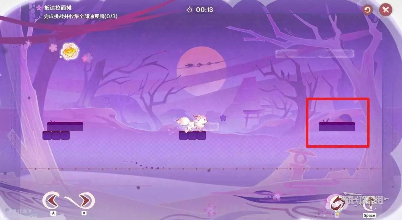 站在鳥居所在固定平台上,走到平台左側,等待移動磚塊出現,快速跳到移動磚塊上往左移動,在到達左側油豆腐所在位置時瞬間切換成噩夢拾取油豆腐,掉落在正下方的固定平台上。