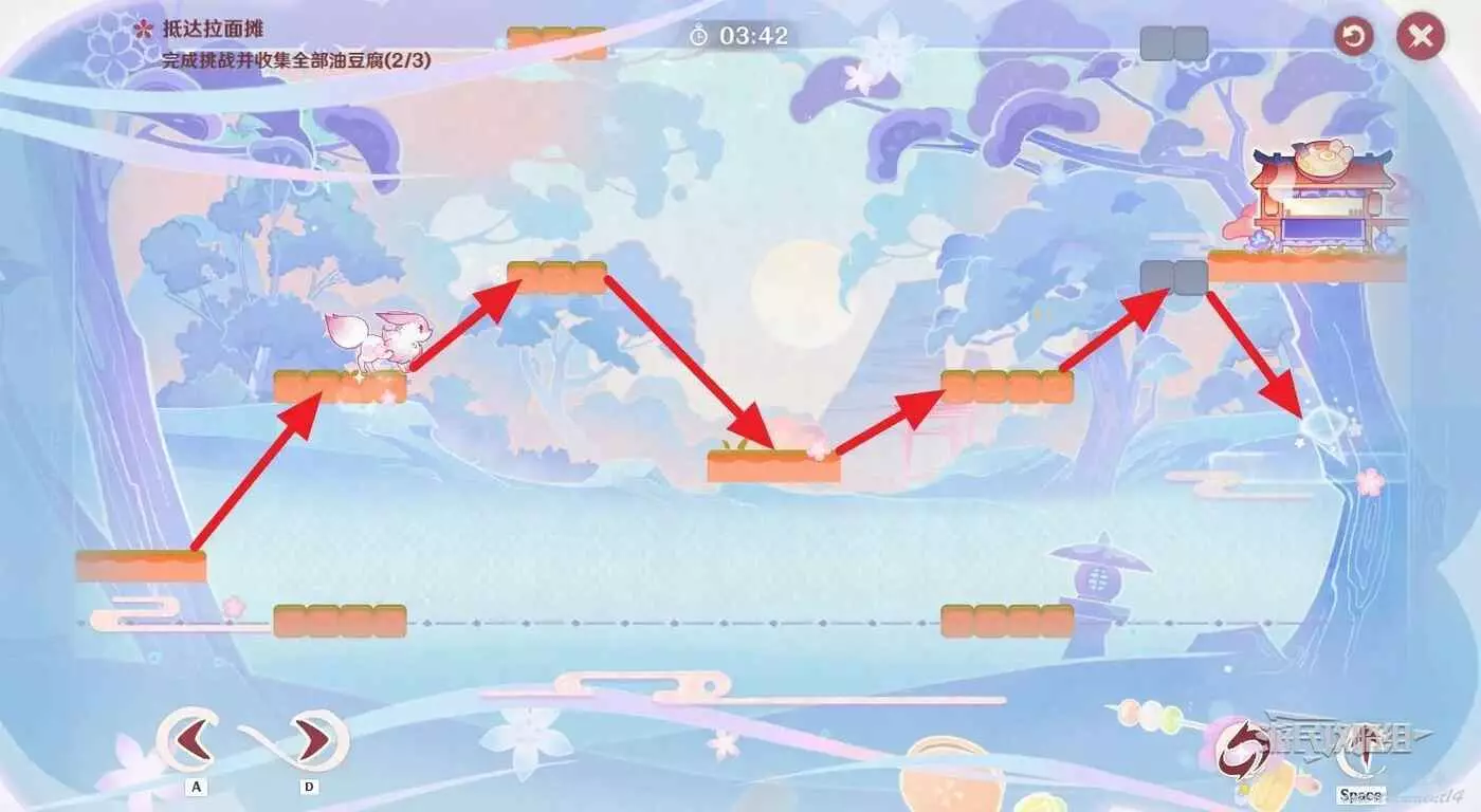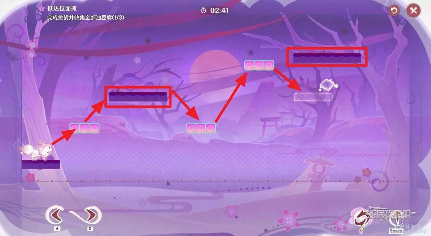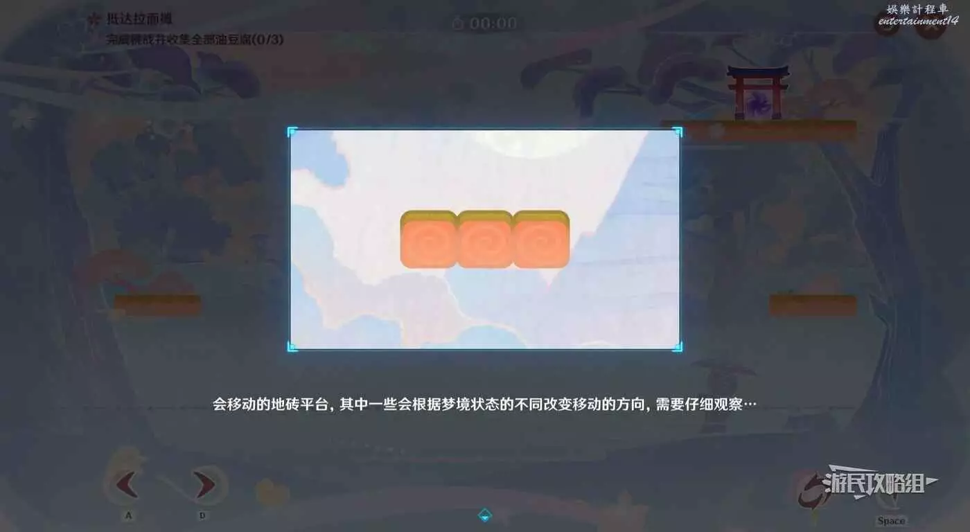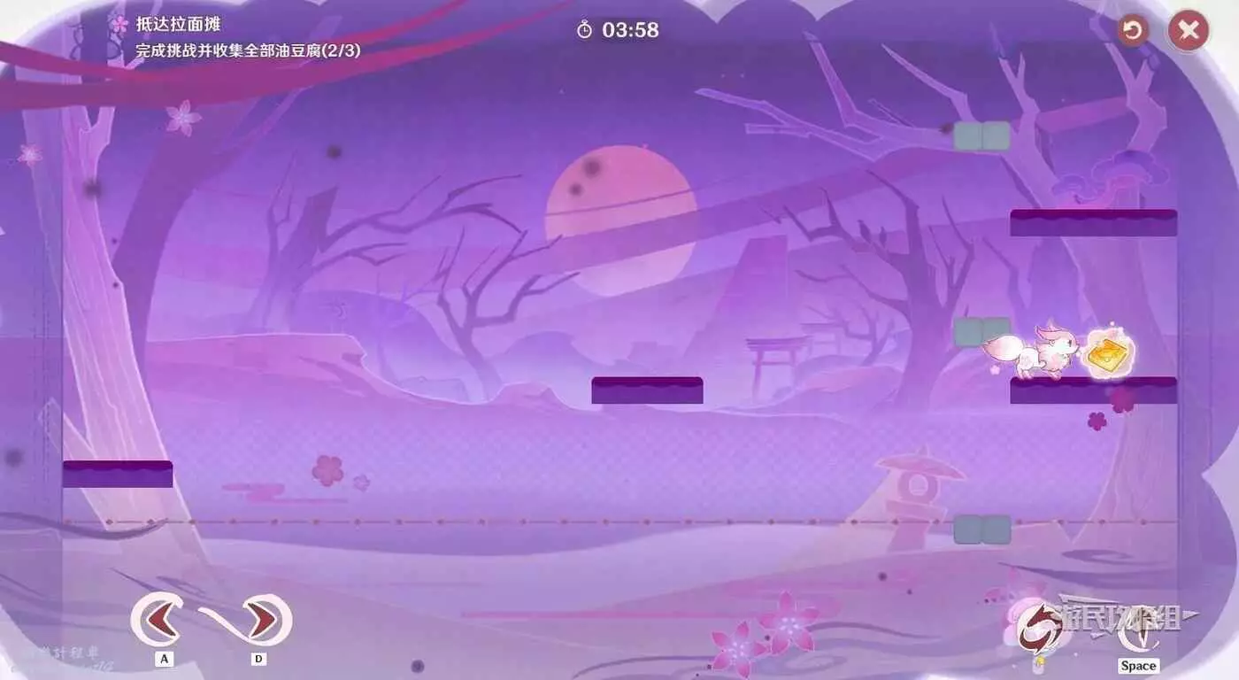 站在鳥居所在固定平台上,走到平台左側,等待移動磚塊出現,快速跳到移動磚塊上往左移動,在到達左側油豆腐所在位置時瞬間切換成噩夢拾取油豆腐,掉落在正下方的固定平台上。