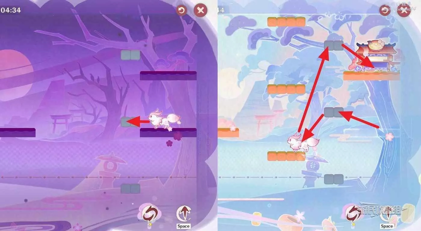 到達固定平台後,切換至美夢,乘坐右側上升平台到達鳥居,進入鳥居到達下一場景。