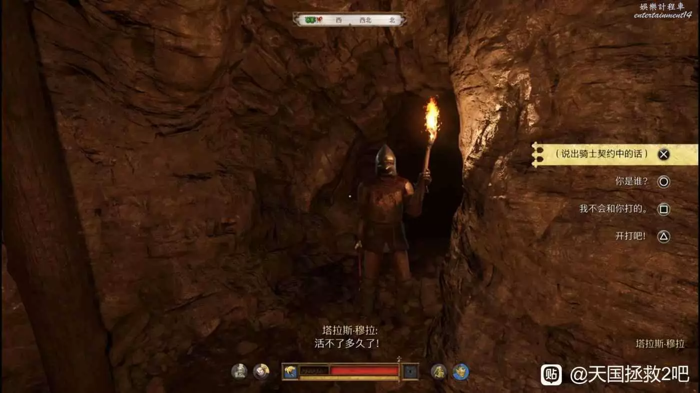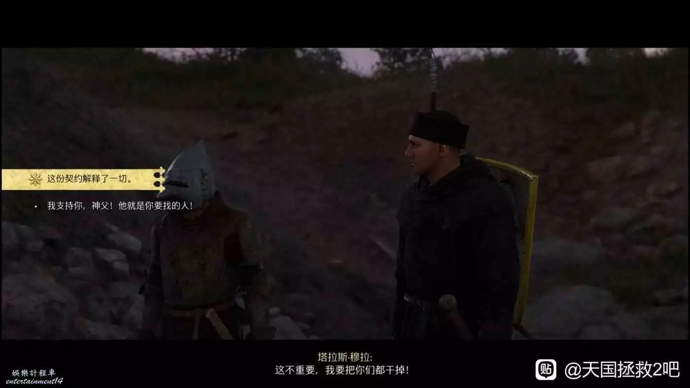 上樓梯,無需拿武器也無需潛行,直接和騎士對峙。這時候有選項,選擇說出契約。