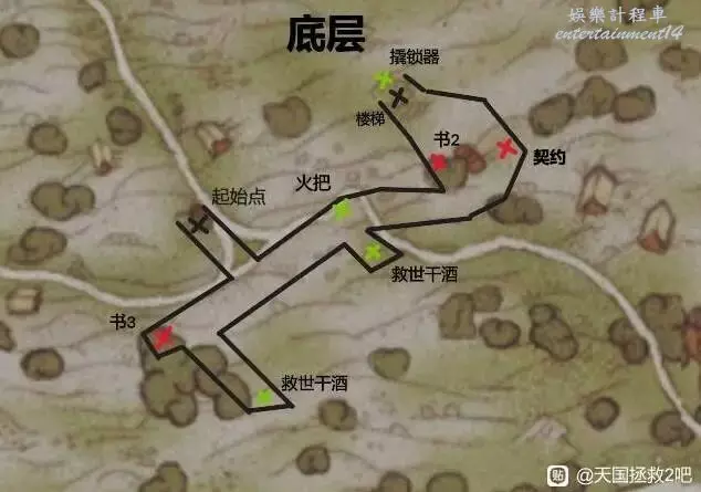 沒喝夜鷹就去圖裡的地方拿到火把,去兩個地方撿4瓶救世幹酒。再拿筆記2和3。撬鎖器在樓梯後,開箱拿到契約。這時候一定要在背包裡讀一下,不然白拿。