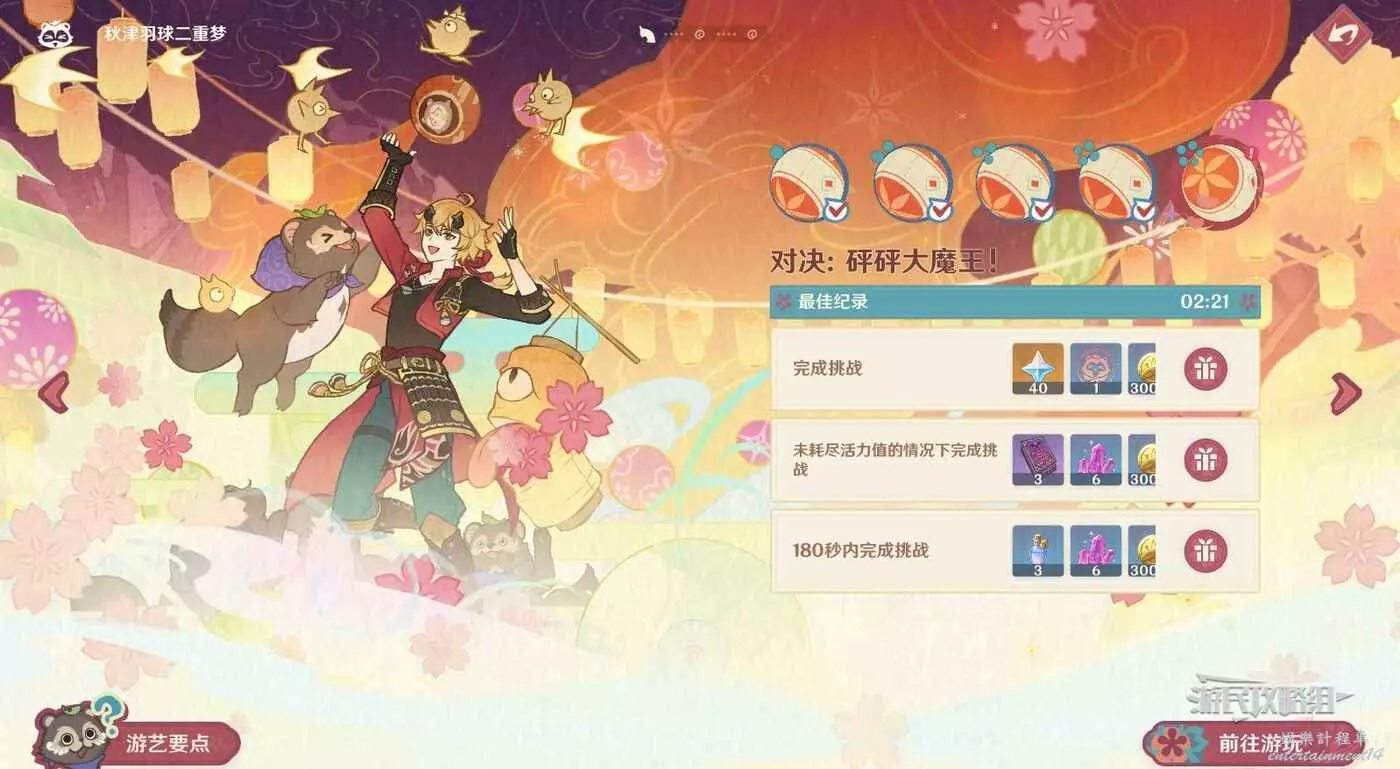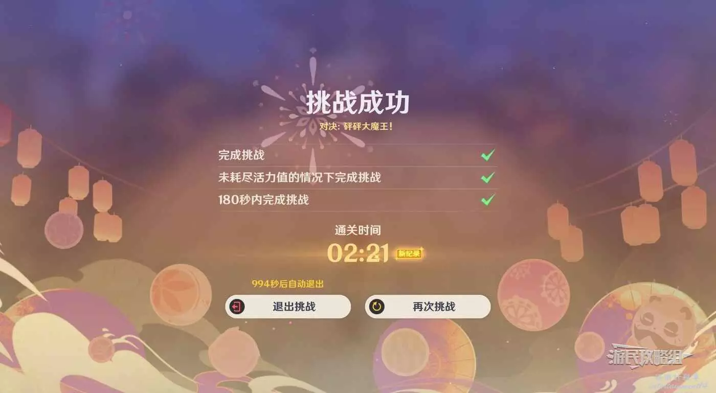 完成挑戰;未耗盡活力值的情況下完成挑戰;180秒內完成挑戰。