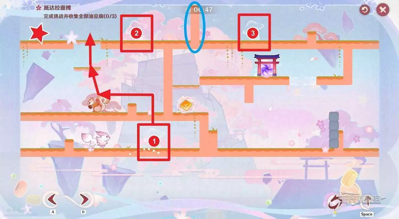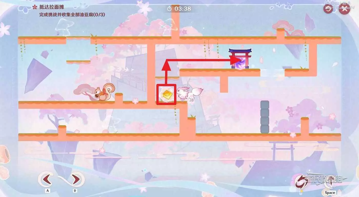 拾取油豆腐,從薄固定牆壁跳到中層,進入鳥居前往下一個場景。