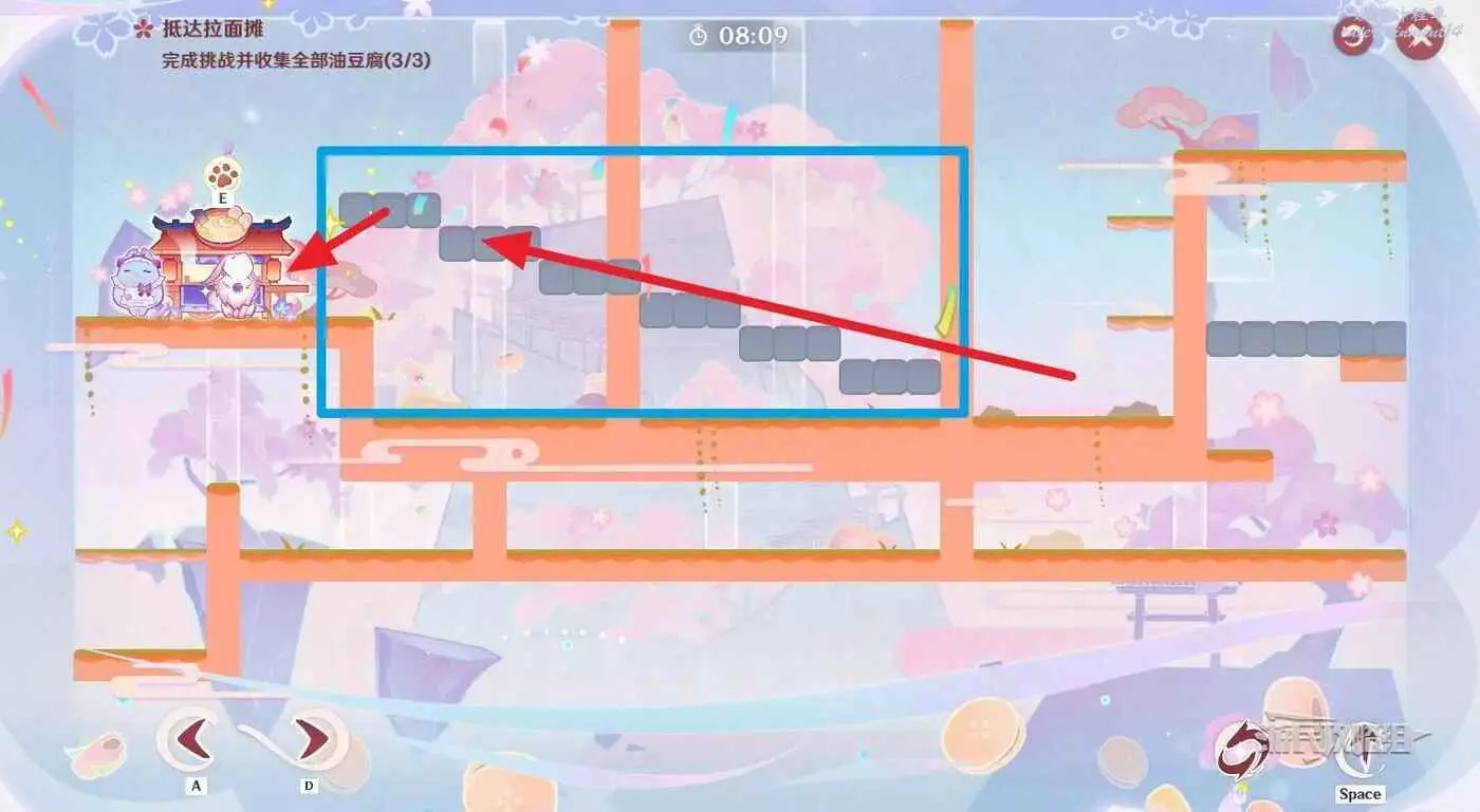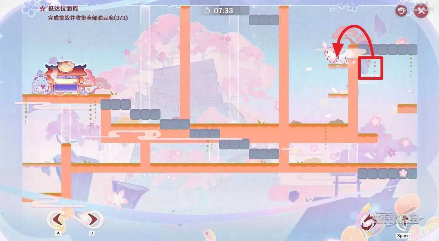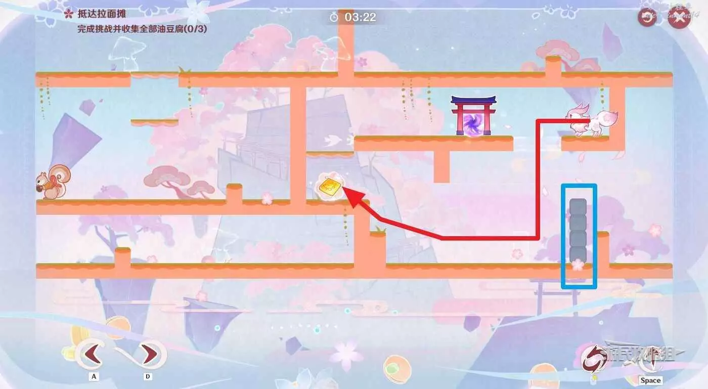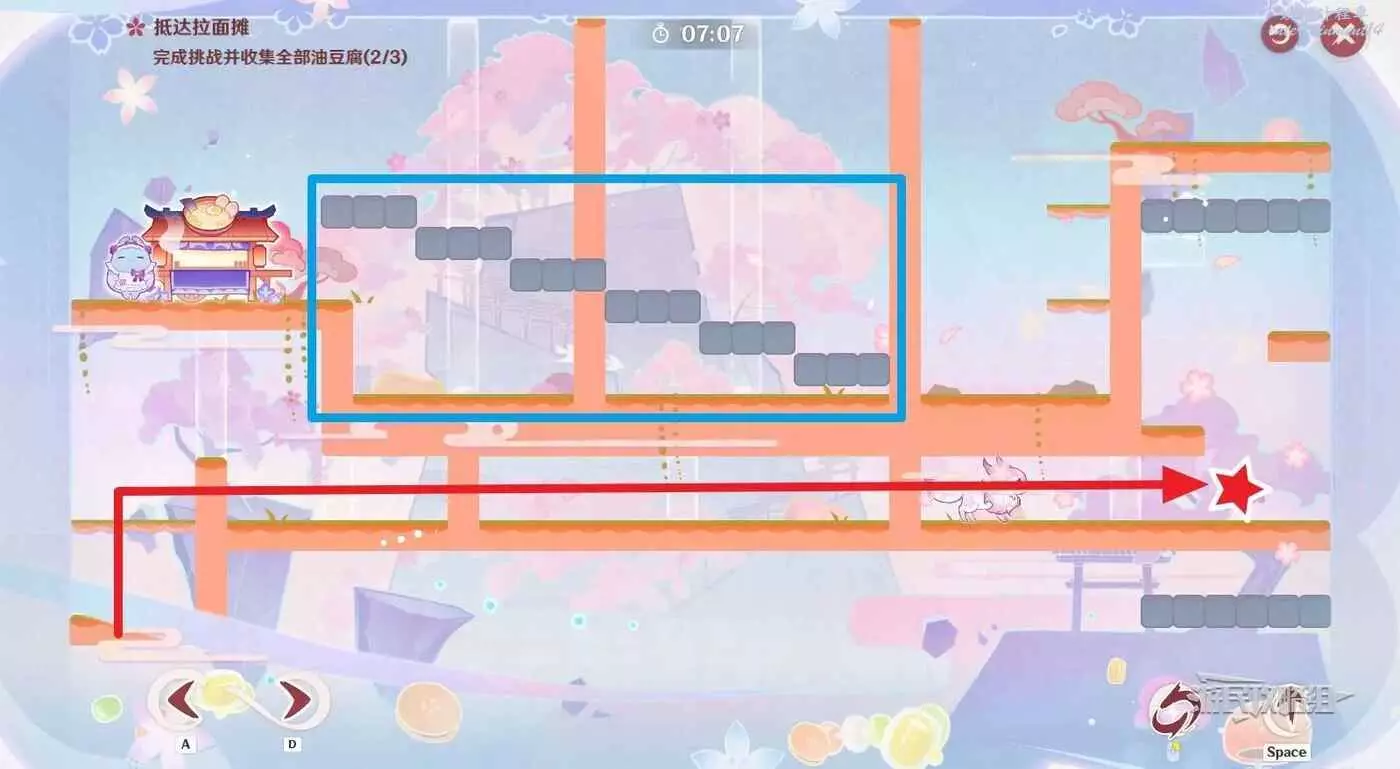 到達星標位置後,乘坐介面右側的灰色移動平台來到上層,切換至噩夢狀態拾取左側高層的油豆腐,迅速跳過固定牆壁來到左側區域,切換至美夢狀態。