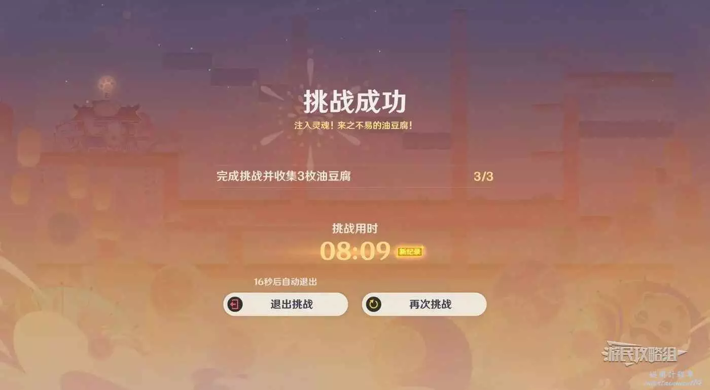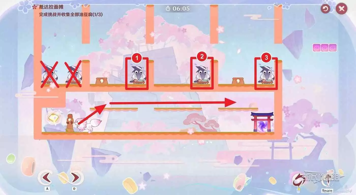 成功抵達拉麵攤;完成挑戰並收集3枚油豆腐