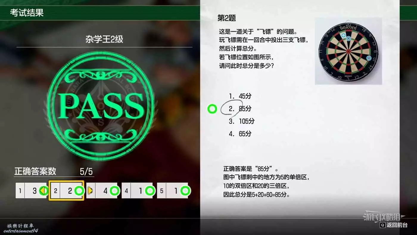這是一道關於“飛鏢”的問題。玩飛鏢需在一回合中投出三支飛鏢,然後計算總分。若飛鏢位置如圖所示,請問此時總分是多少?——【85分】