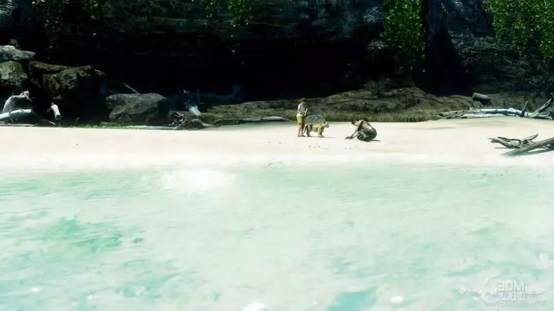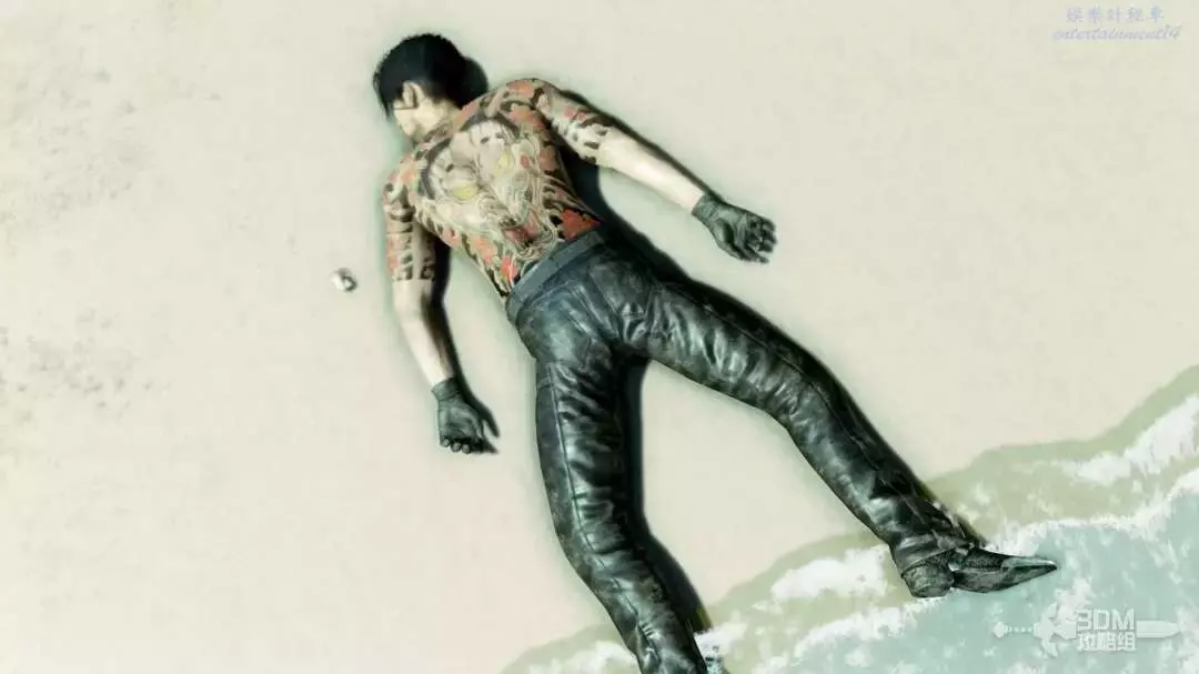 畫面一轉,真島被海水沖刷上岸,靜靜的躺在沙灘上,這場景像極了電影盜夢空間的開場。