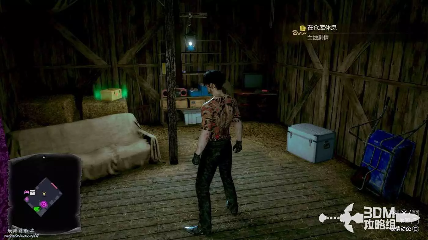 說完幾句話以後,解鎖第一個據點,裡面有道具箱以及恢復生命的藥箱,角落的電視還可以玩世嘉以前的懷舊小遊戲,還可以改變自己的服飾。