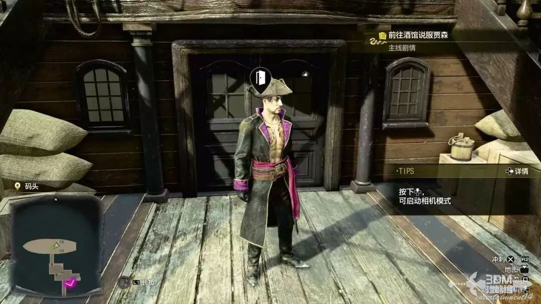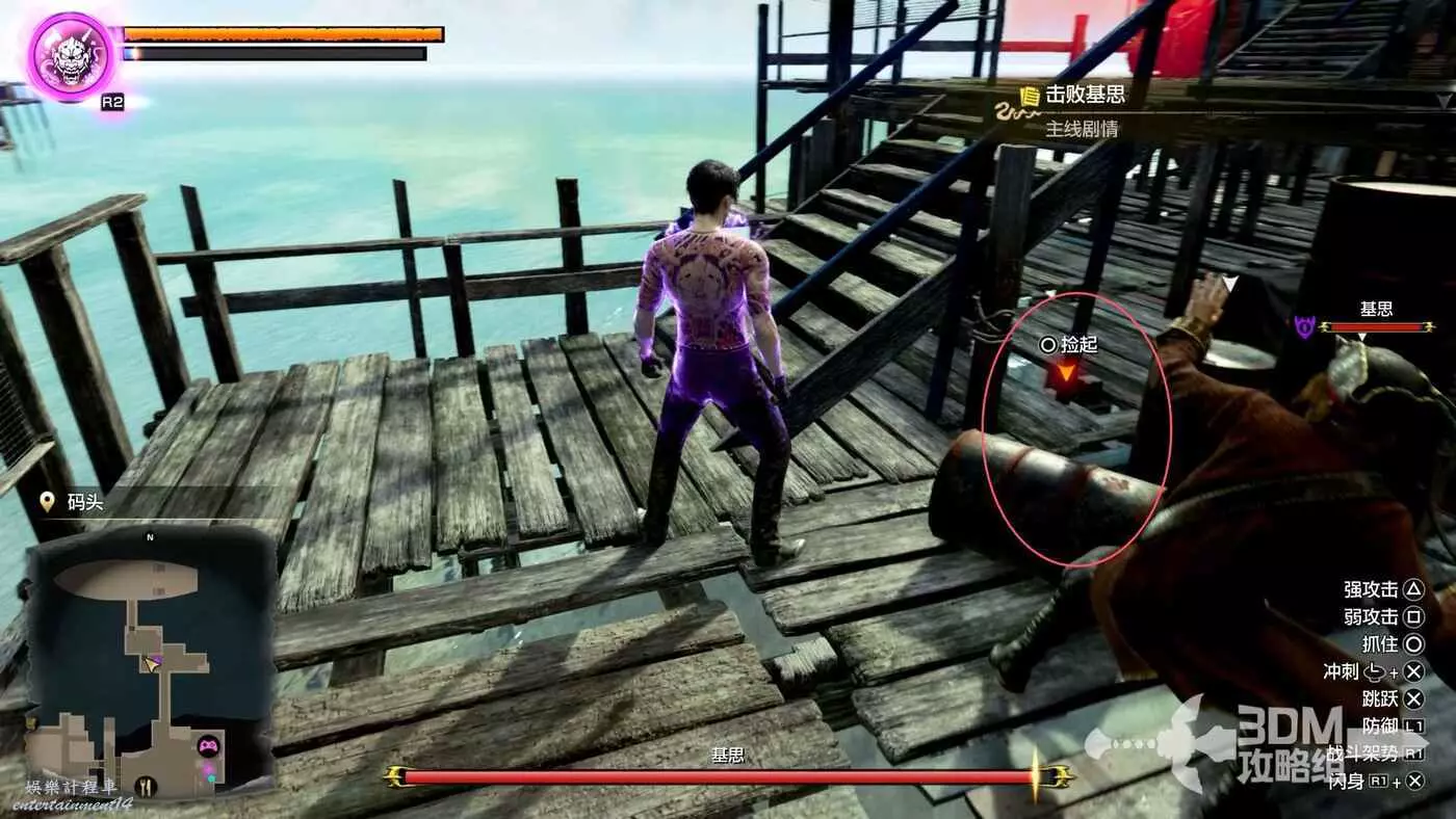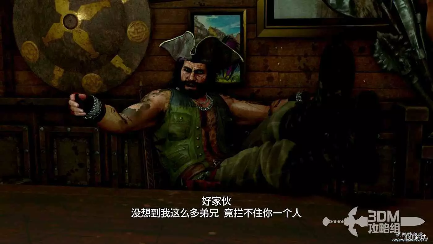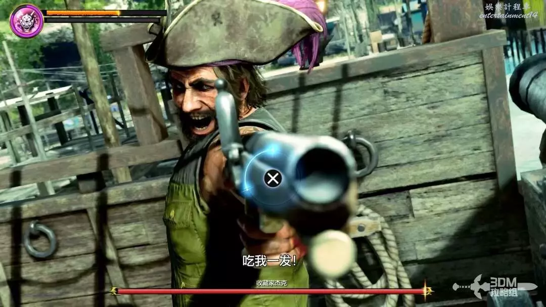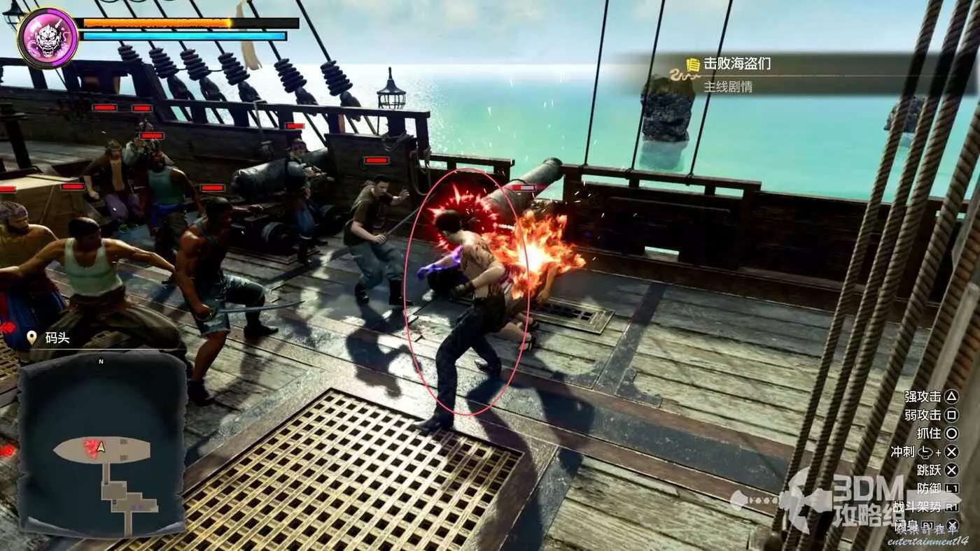 擊敗基斯上船後還要和船上的海盜們打一架。會出現拿槍的敵人,在敵人開槍的時候會有蜘蛛感應一樣的圖示提示,直接閃避,或者提前就去先擊殺拿遠端武器的敵人。