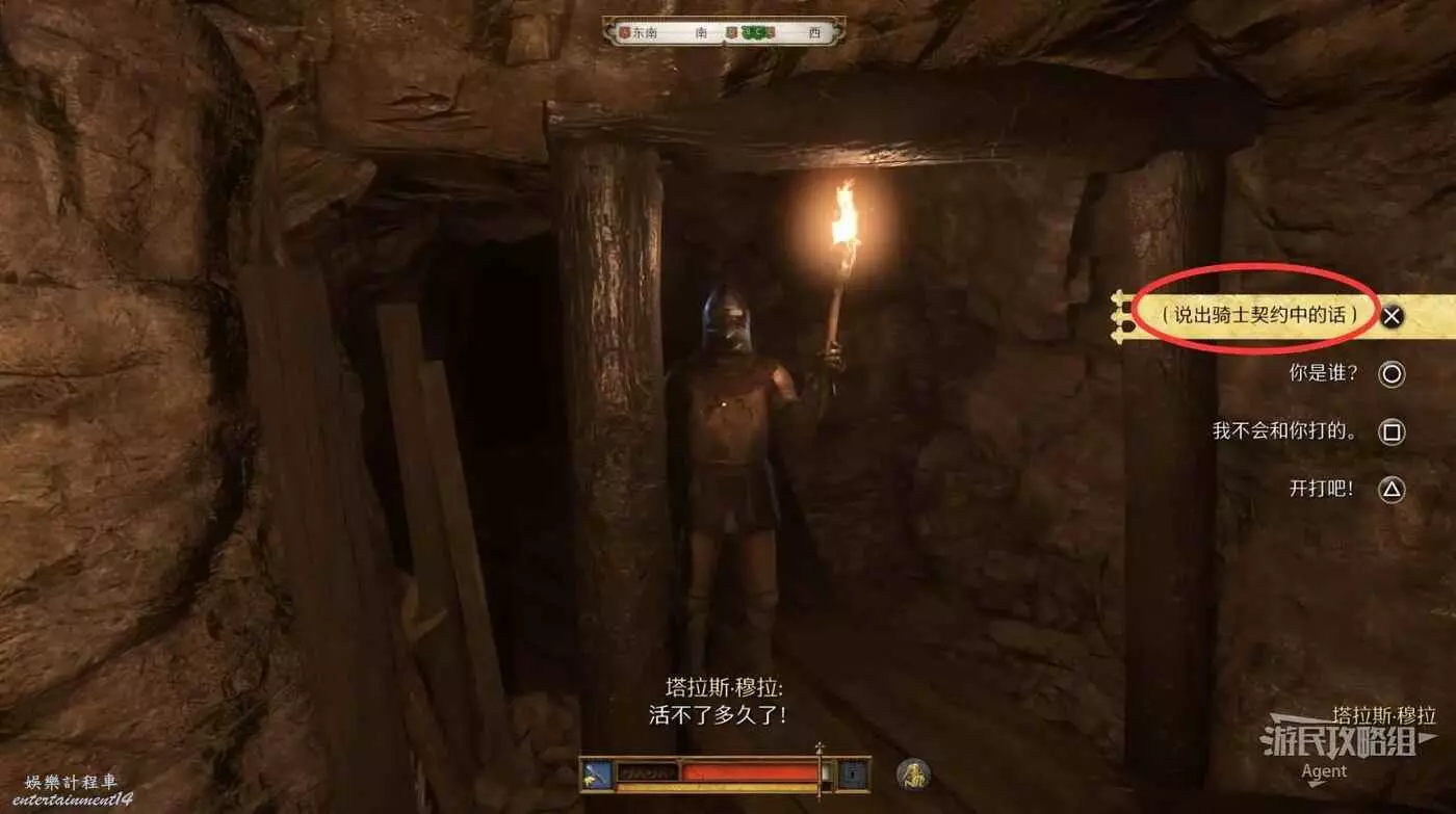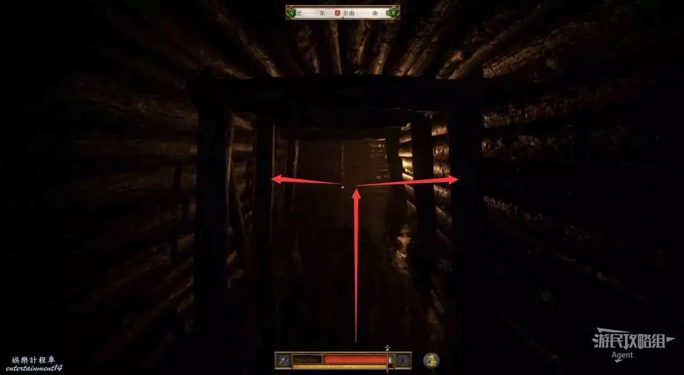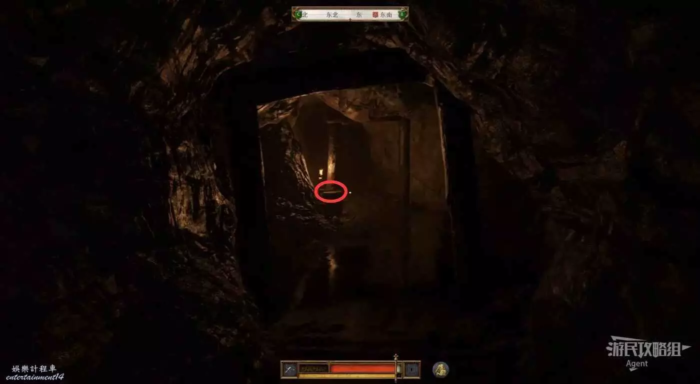 掉下來後裝備又被扒光了,往前走來到分岔路口,看到神秘騎士往左邊跑了。我們先去右邊的死路探索,然後回來走左邊追神秘騎士,怕黑的話可以先去左邊拿到火把再探索右邊。