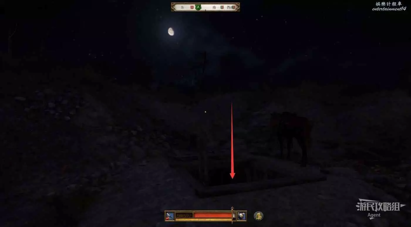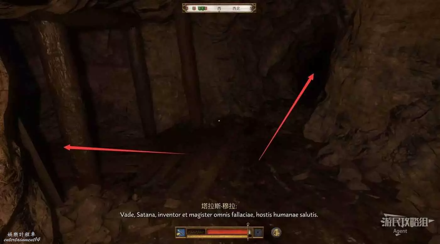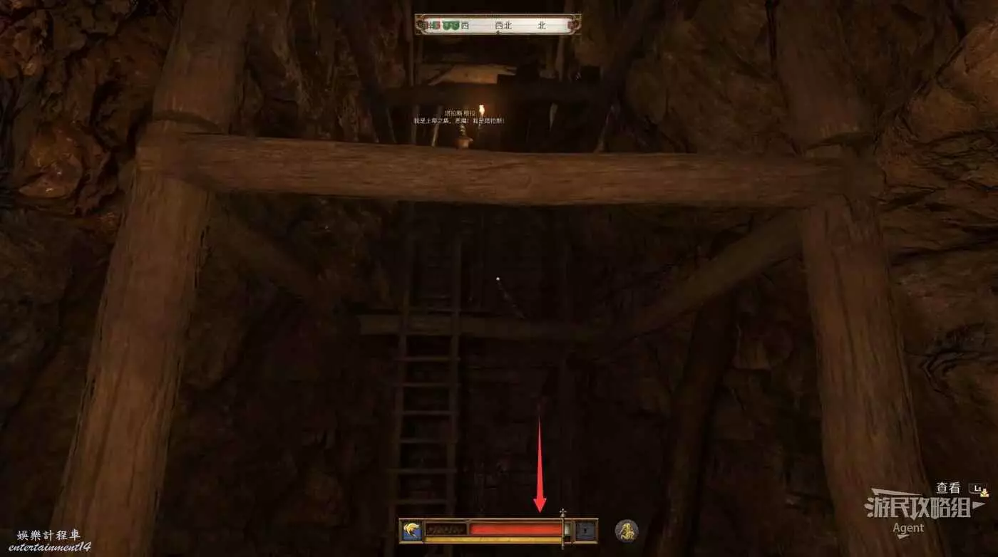 掉下來後裝備又被扒光了,往前走來到分岔路口,看到神秘騎士往左邊跑了。我們先去右邊的死路探索,然後回來走左邊追神秘騎士,怕黑的話可以先去左邊拿到火把再探索右邊。