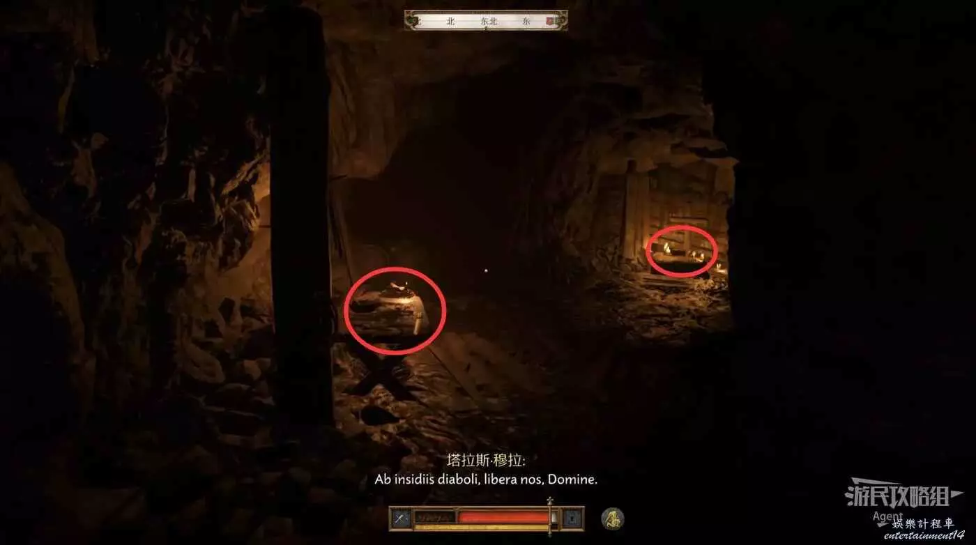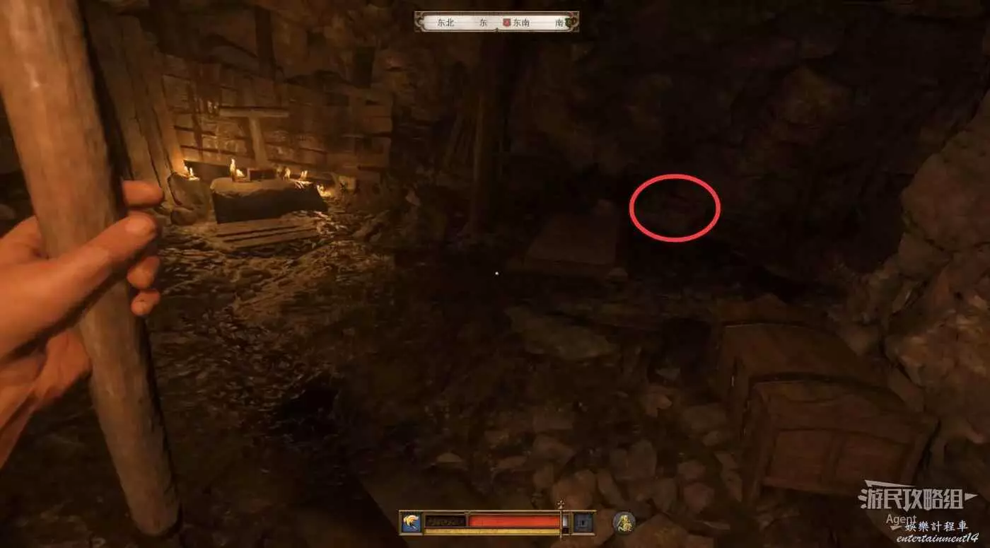回來走左邊,插著火把的木桶上拿到火把用來照明,木桶一旁的洞裡有救世幹酒。