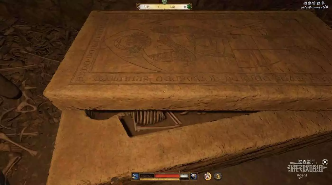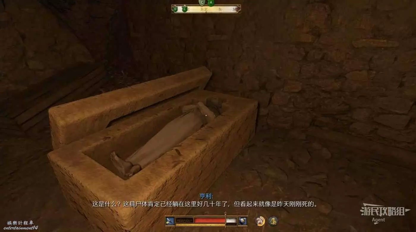 掉下來後,用火把照明,一邊收集骸骨一邊探索,發現瓦倫丁爵士的棺材。