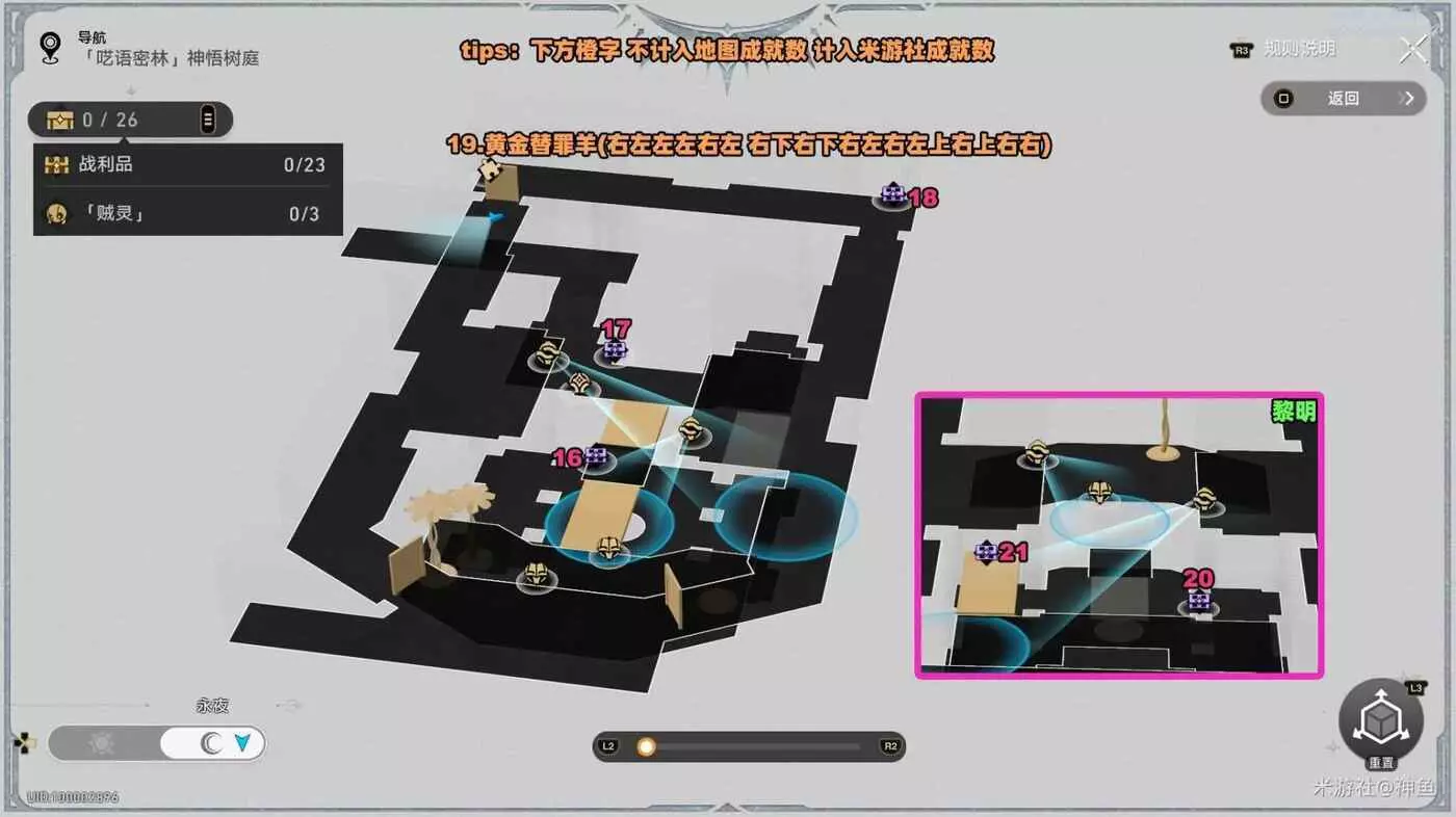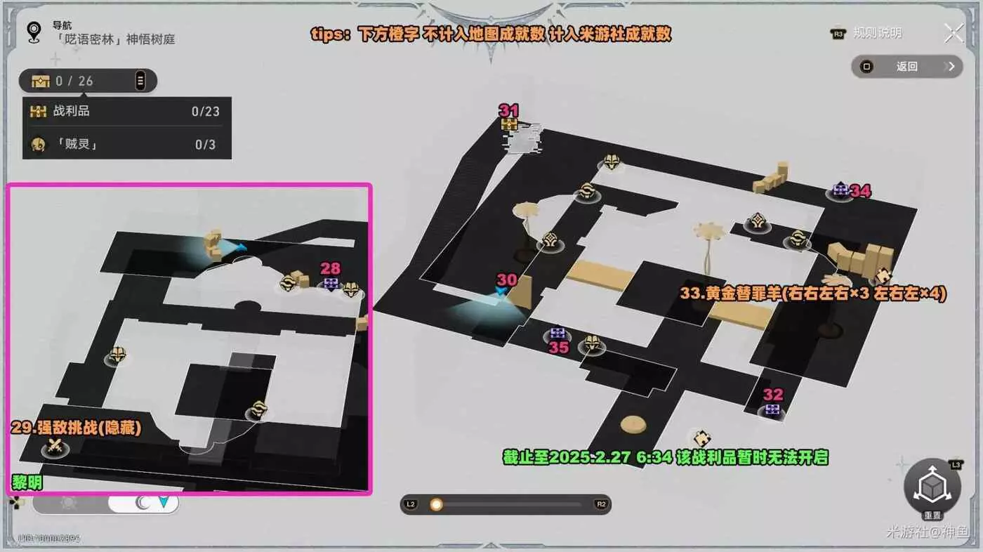 『永夜「囈語密林」神悟樹庭』36個戰利品=「23個可見戰利品」+「3個賊靈」+「2個黃金短矛」+「3個黃金替罪羊」+「2個預言算碑」+「1個紮格列斯之手」+「1個強敵挑戰」。