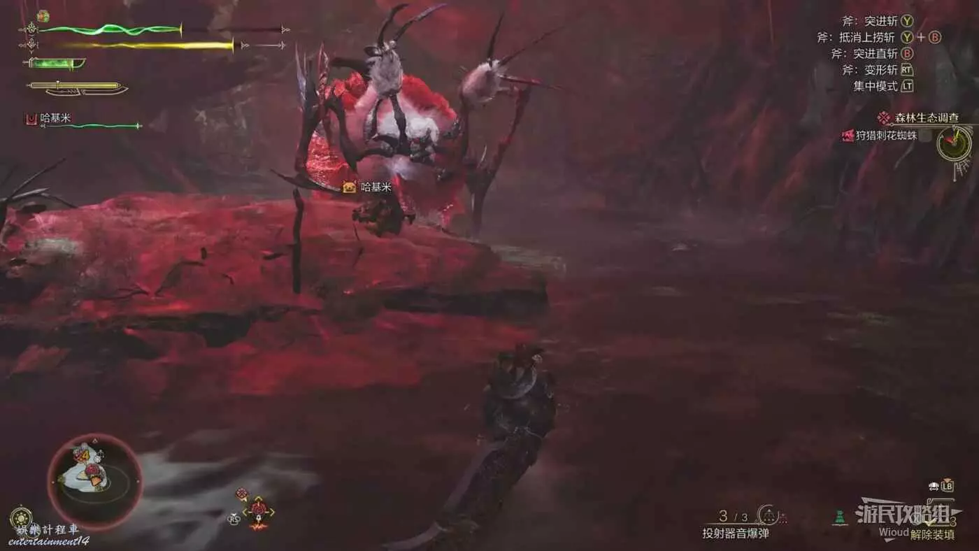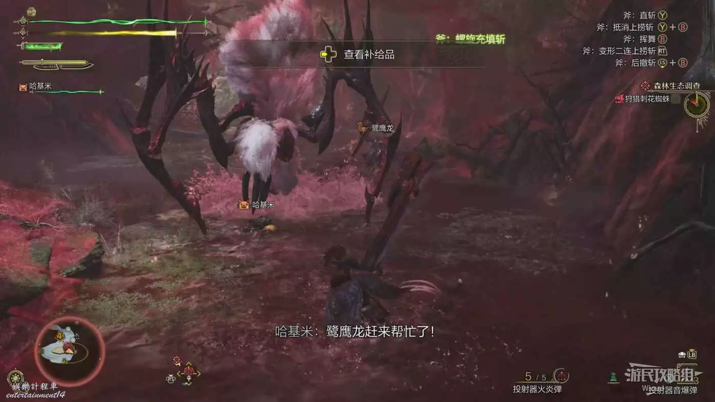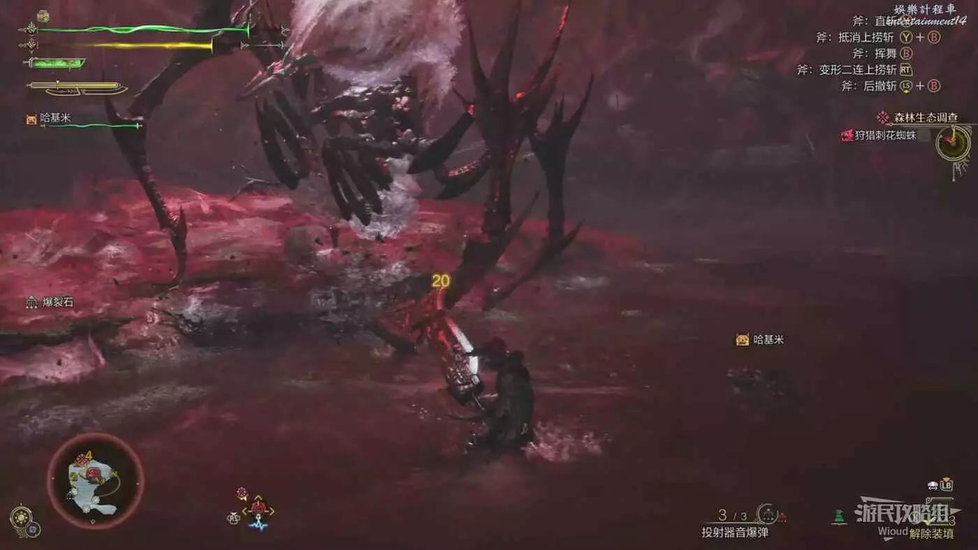 刺花蜘蛛張開兩個前爪開始蓄力,數秒後直接砸向地面,前搖有一定反應時間,看到前搖立刻往兩邊翻滾而不是前後。