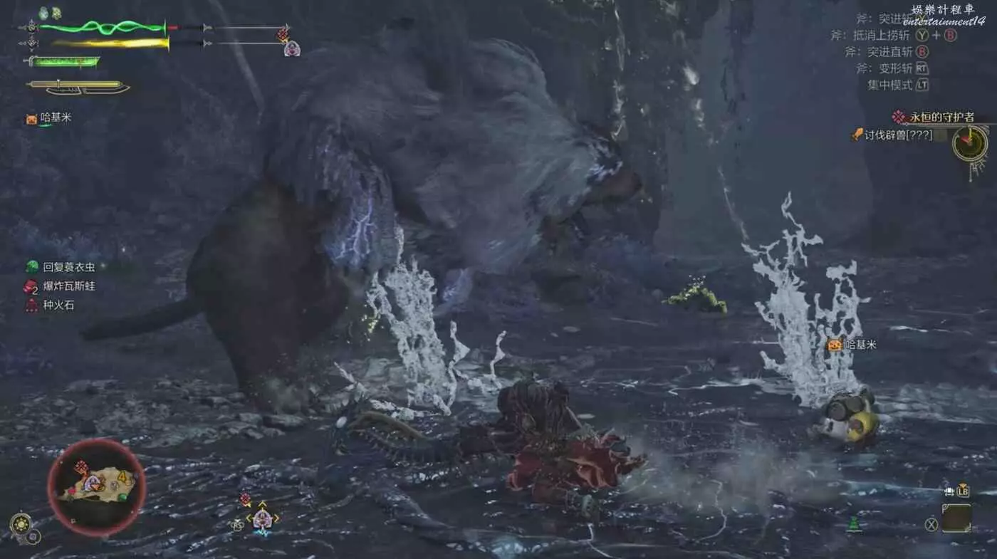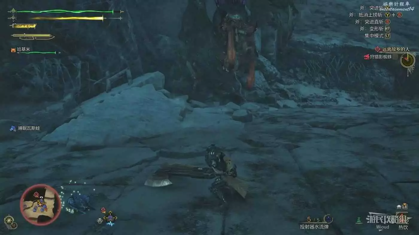 使用此招前,纏蛙有一個明顯的蓄力狀態,看到纏蛙蓄力立刻往兩側躲避,纏蛙蓄力完成後向前往衝刺並造成持續傷害。