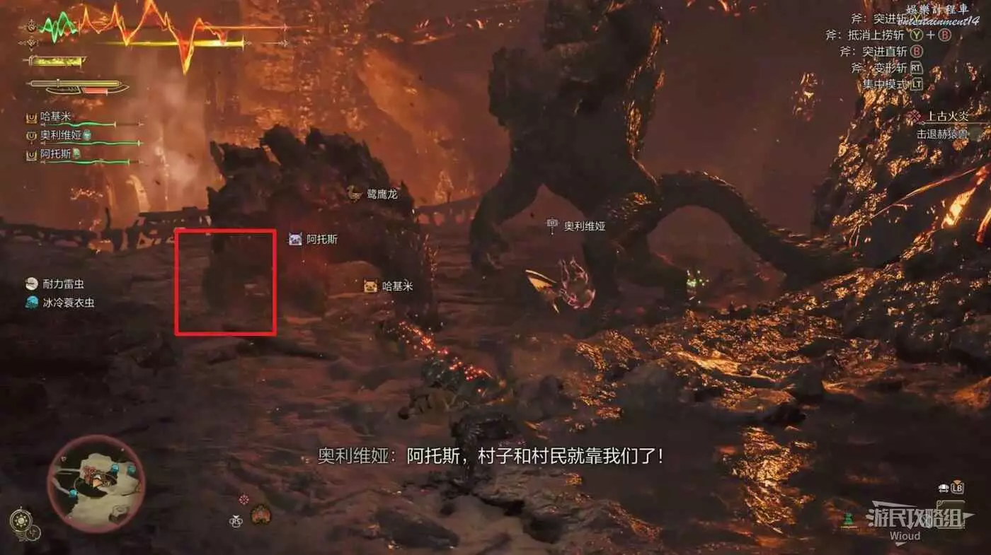 炎尾龍一邊張大嘴巴一邊抬高腦袋,看到這個前搖立刻遠離炎尾龍朝向區域,前搖結束後炎尾龍會直接朝目視方向咬一口。