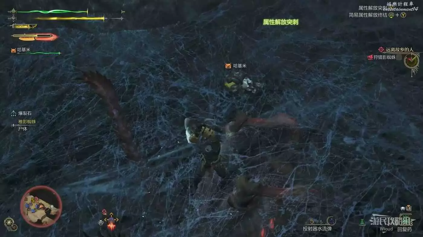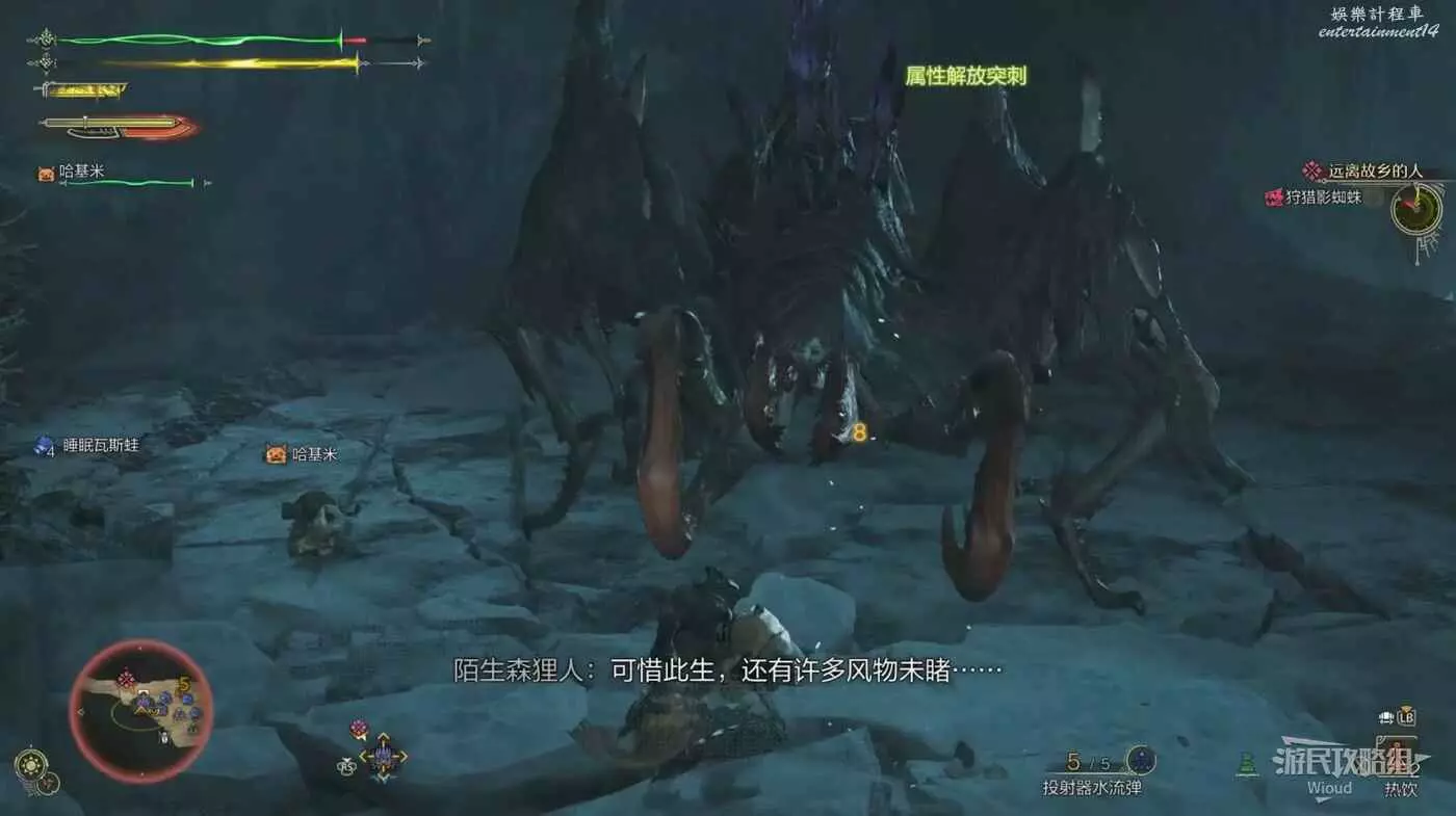 蜘蛛先伸出一隻手開始蓄力,幾秒後伸出的手會以極快的速度向前攻擊,看到前搖就立刻往側面移動躲避。