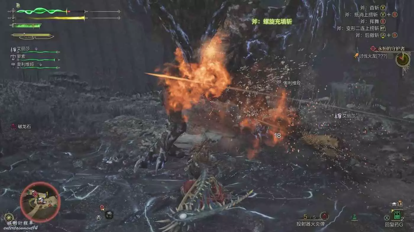 地面招式,火龍降低重心直接朝著某個方向進行突刺,前後左右都有較大距離的傷害判定,遇到這招需要立即遠離。