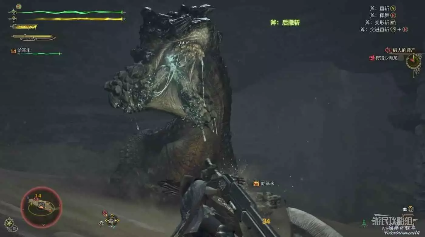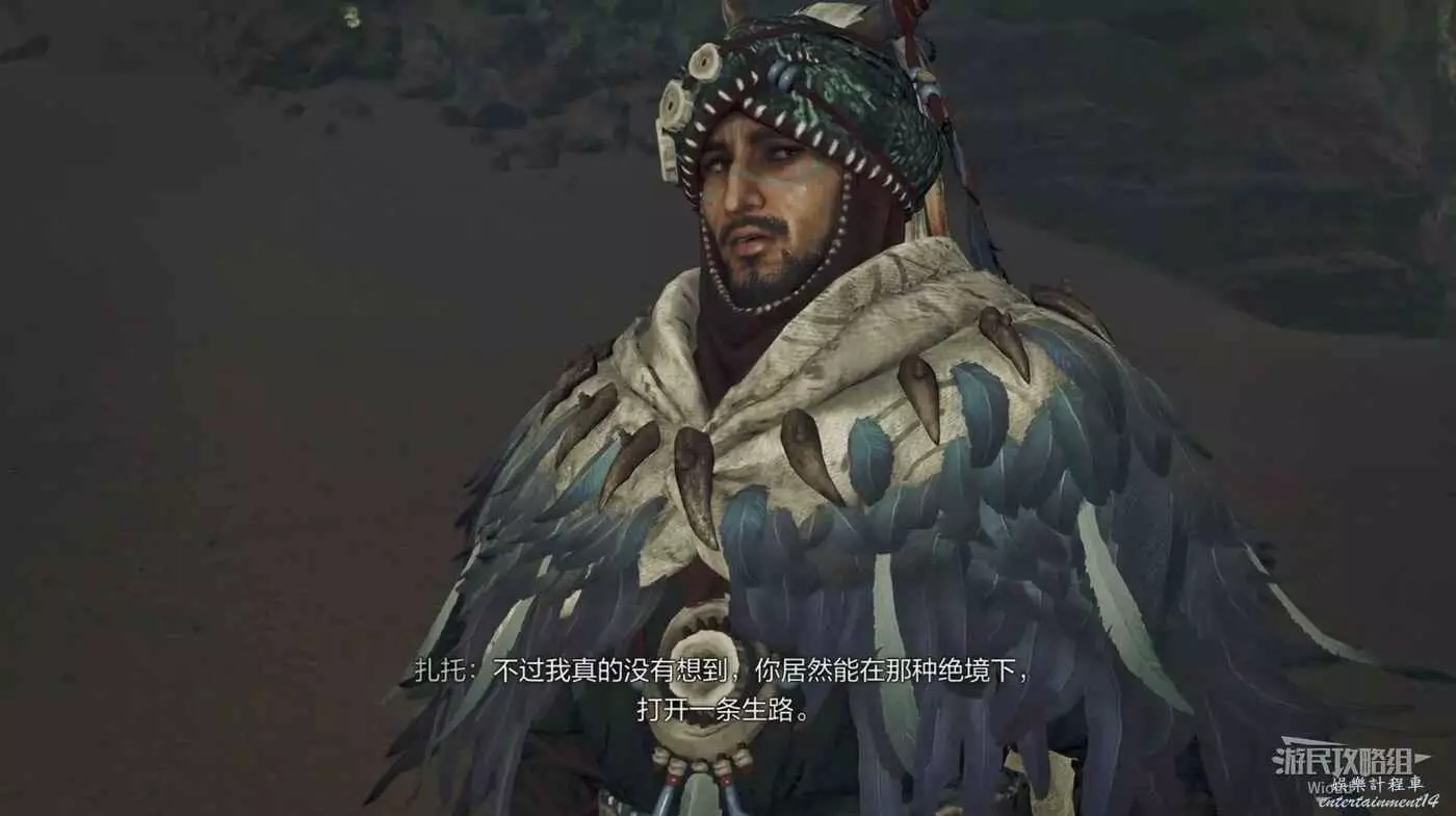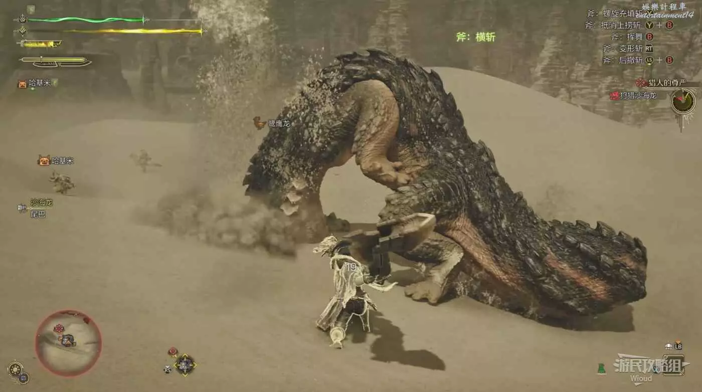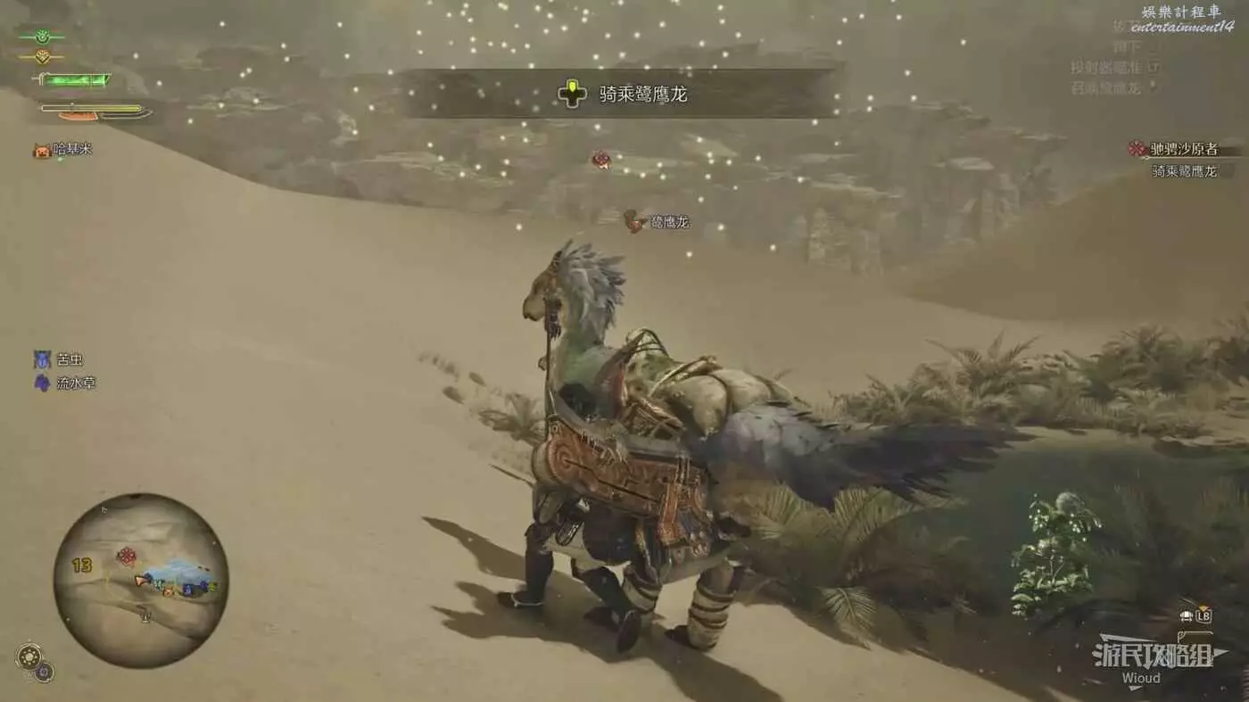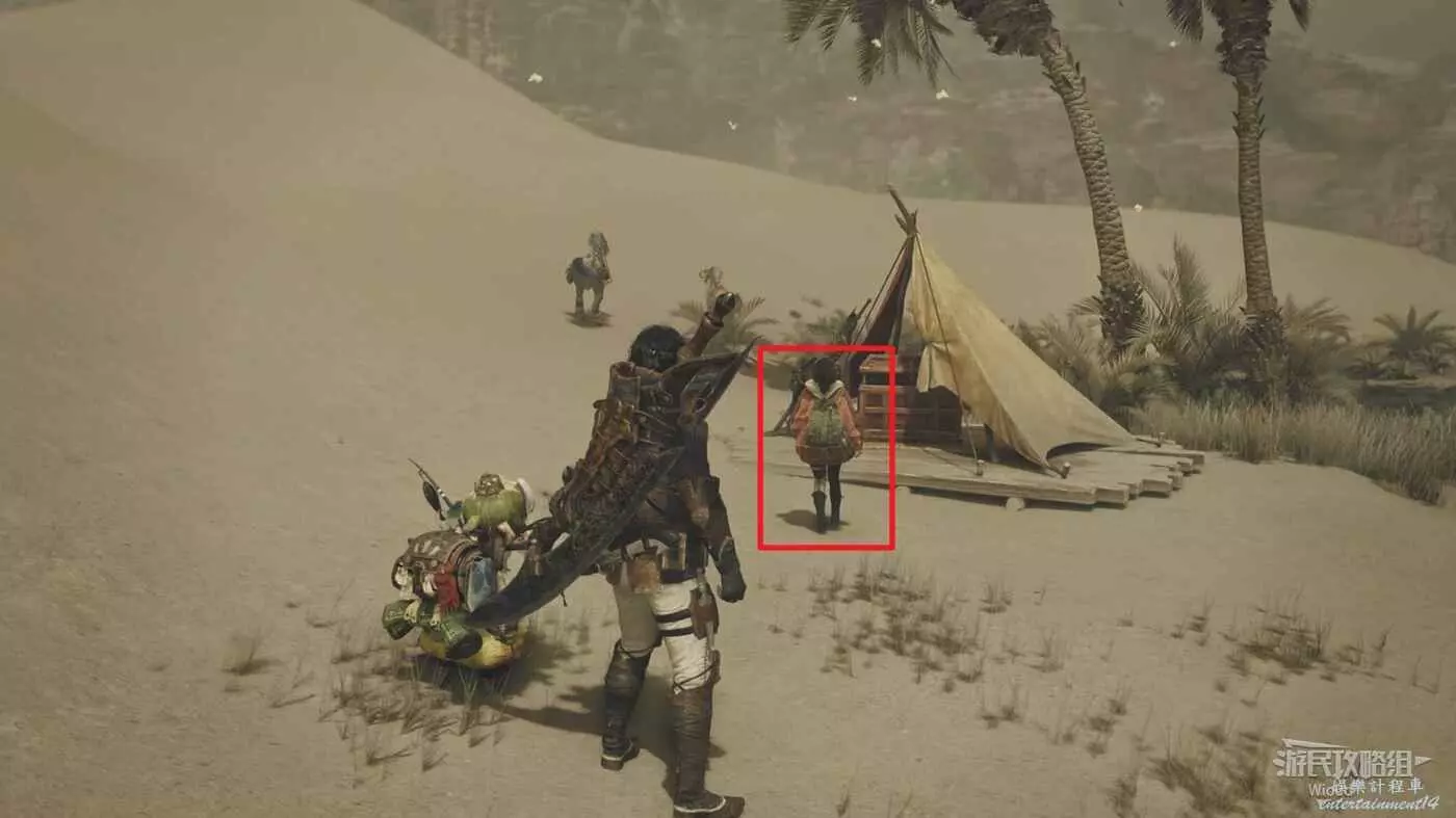 當玩家第一次乘船來到封禁之地的沙漠地區時看到一個被一群沙海龍襲擊的女孩,跳下去開始第一次狩獵。
