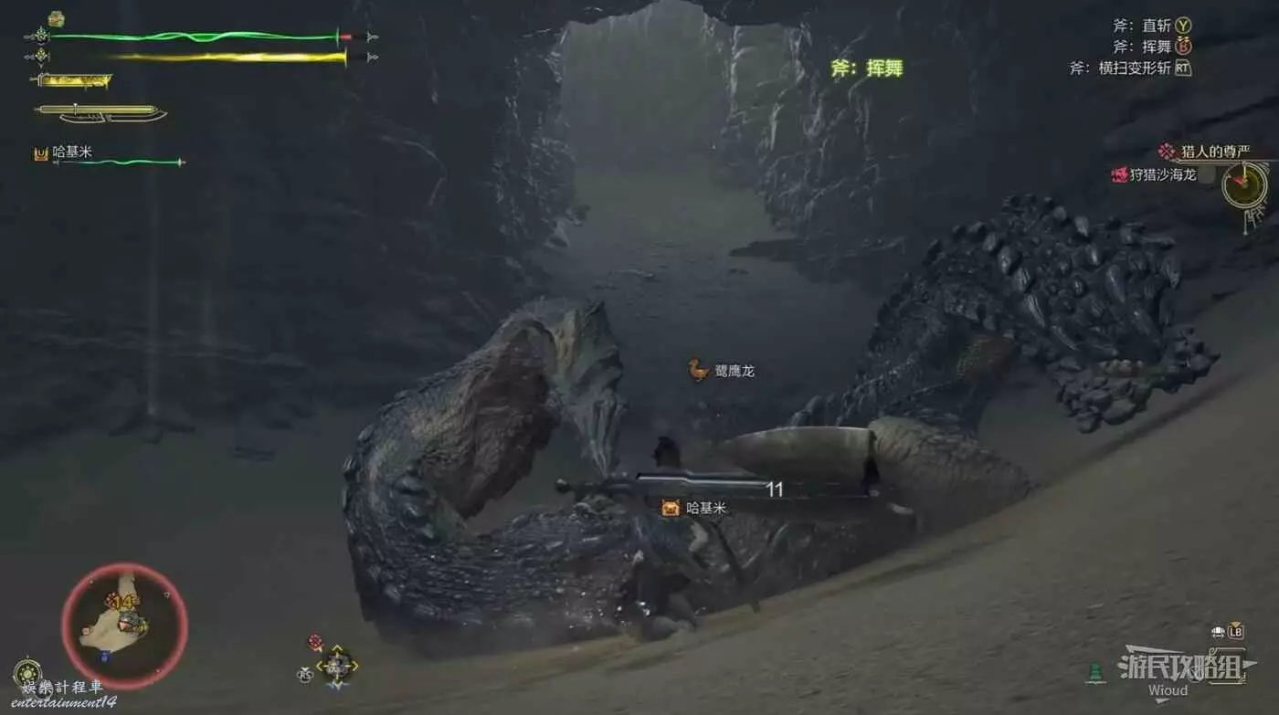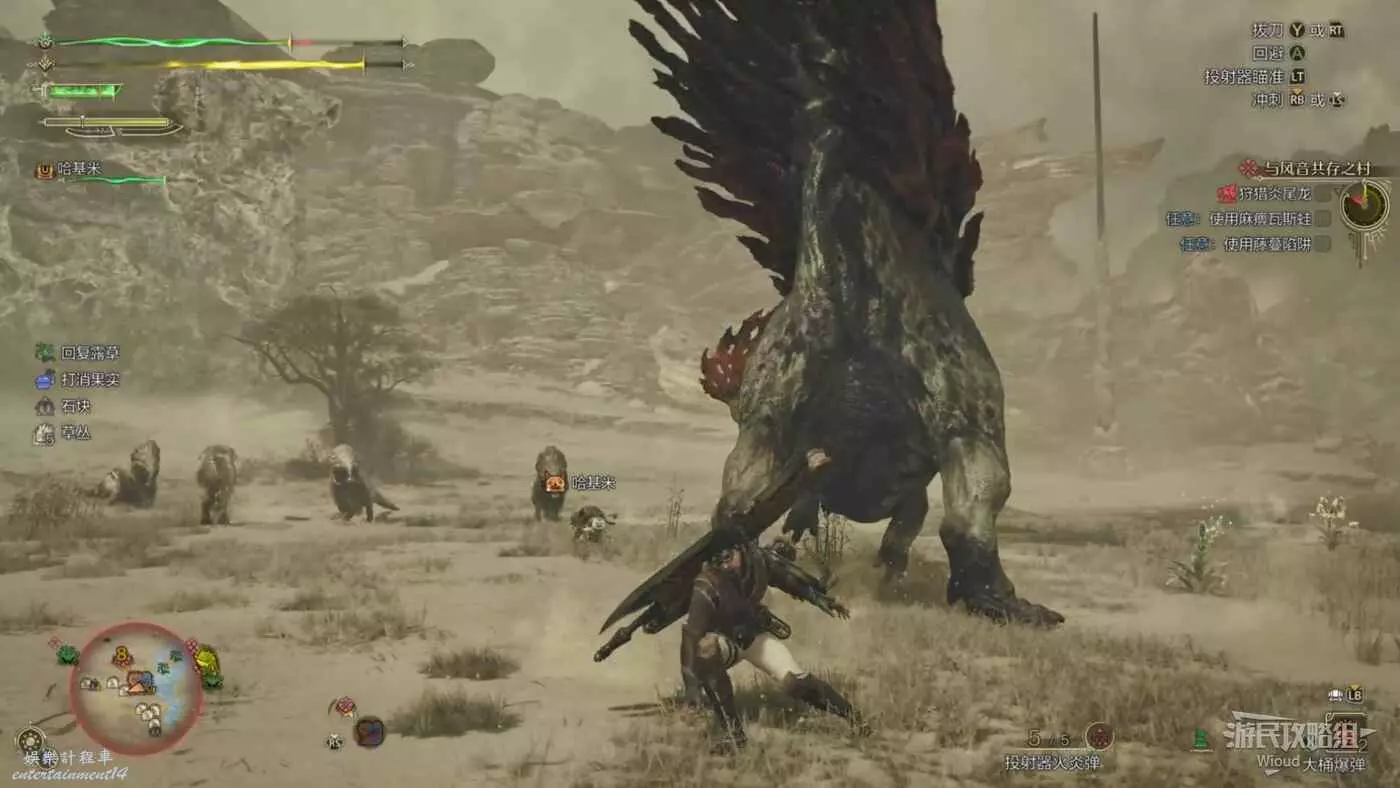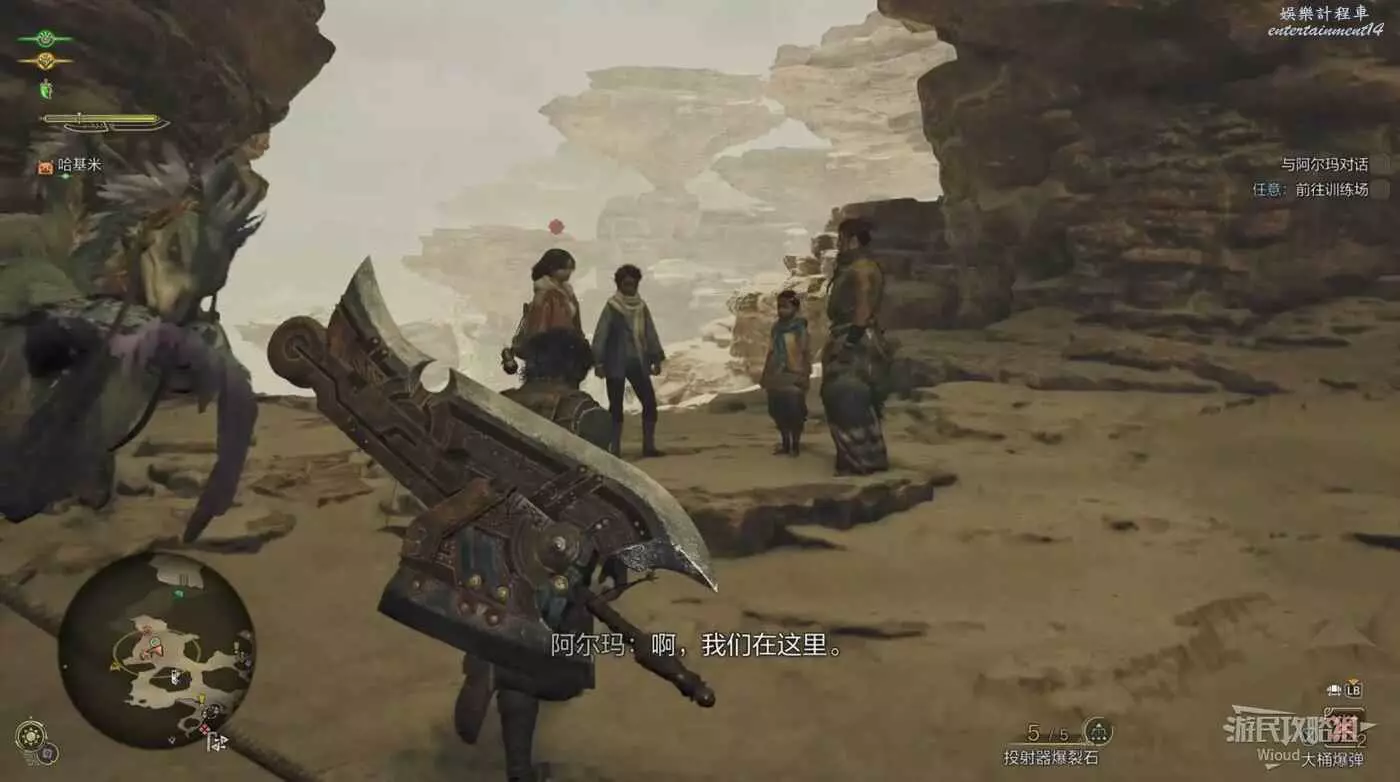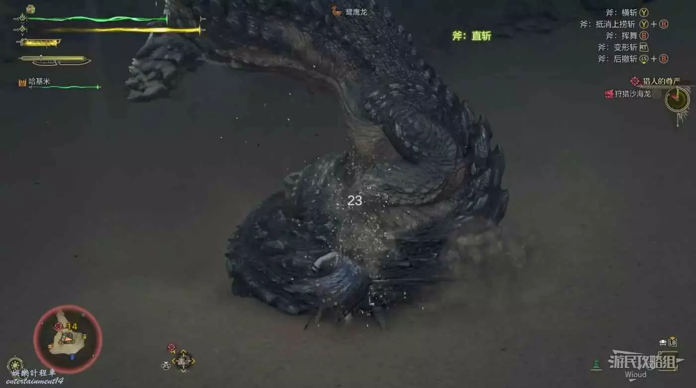 當玩家第一次乘船來到封禁之地的沙漠地區時看到一個被一群沙海龍襲擊的女孩,跳下去開始第一次狩獵。