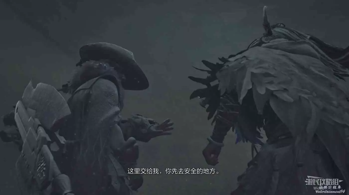 擊敗護火龍後觸發劇情,然後跟著NPC進入守護者的村子,此時我們也能從老爺子之口窺探一些關於白色孤影的真相。