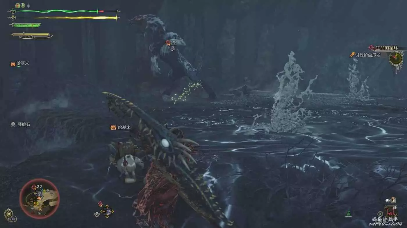 纏蛙的攻擊方式很簡單,出招的部位主要有兩隻前爪、嘴咬以及衝刺突進,動作有較為明顯的前搖,是相對簡單的怪物。