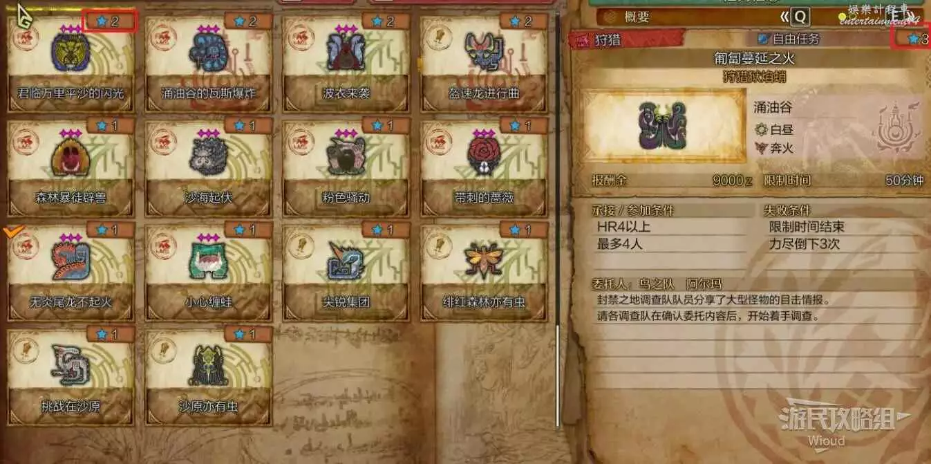 不同任務之間是有明確分級的,玩家正式進入任務前,玩家可以面板左側任務標籤的右上角與螢幕右側看到任務的星級,星級越高難度越高,給的獎勵越好。