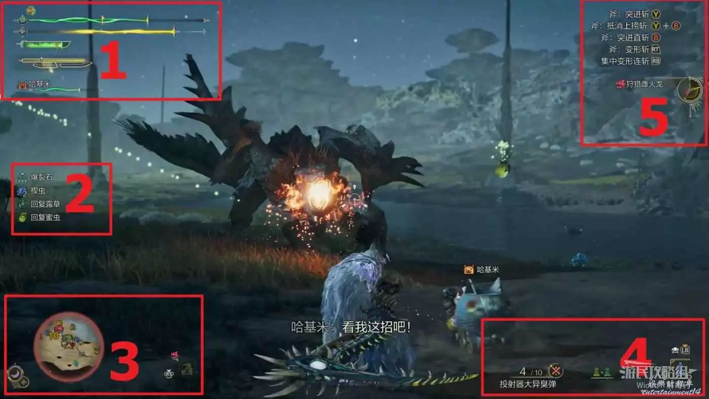 1、從上到下分別為玩家的血條【綠】、玩家的體力條【黃】、武器鋒利度【綠】、特殊武器圖示【黃】、玩家隨從的血條【綠】。