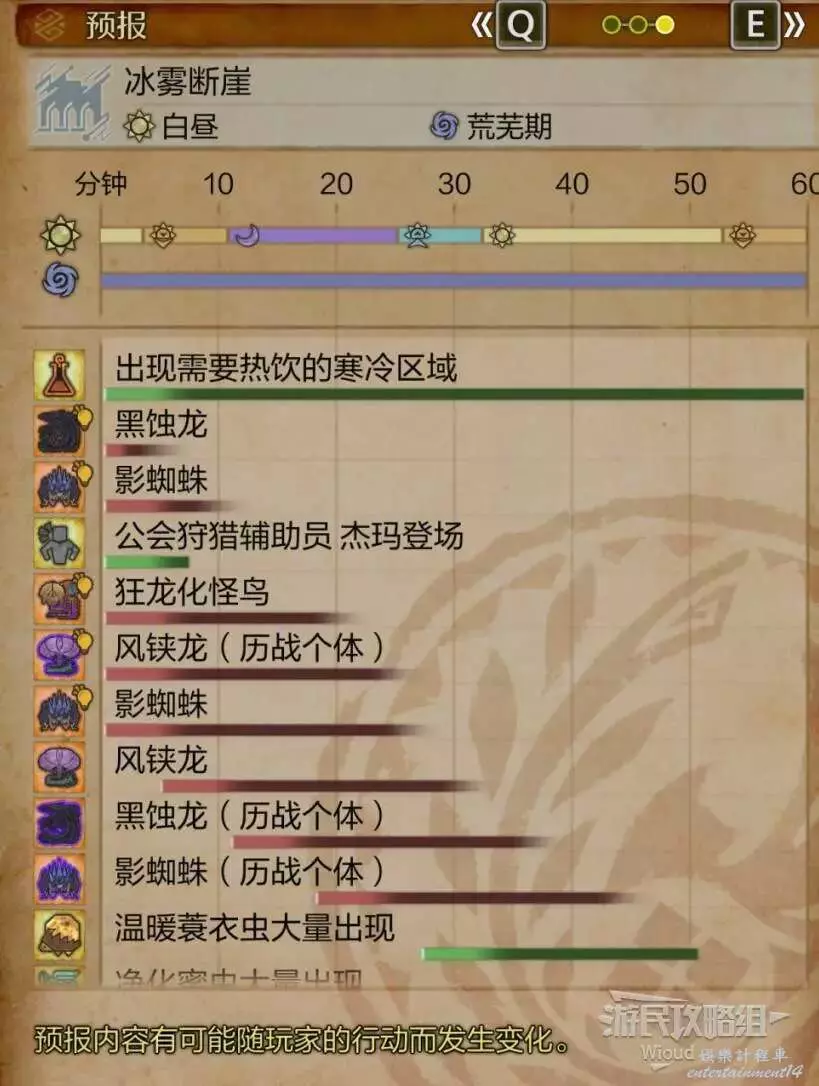 打開地圖選擇全域地區,然後選擇某個地區,滑鼠移動到螢幕右側的環境報告翻到第三頁即可看到這個地區不同時間與氣候會出現的怪物。