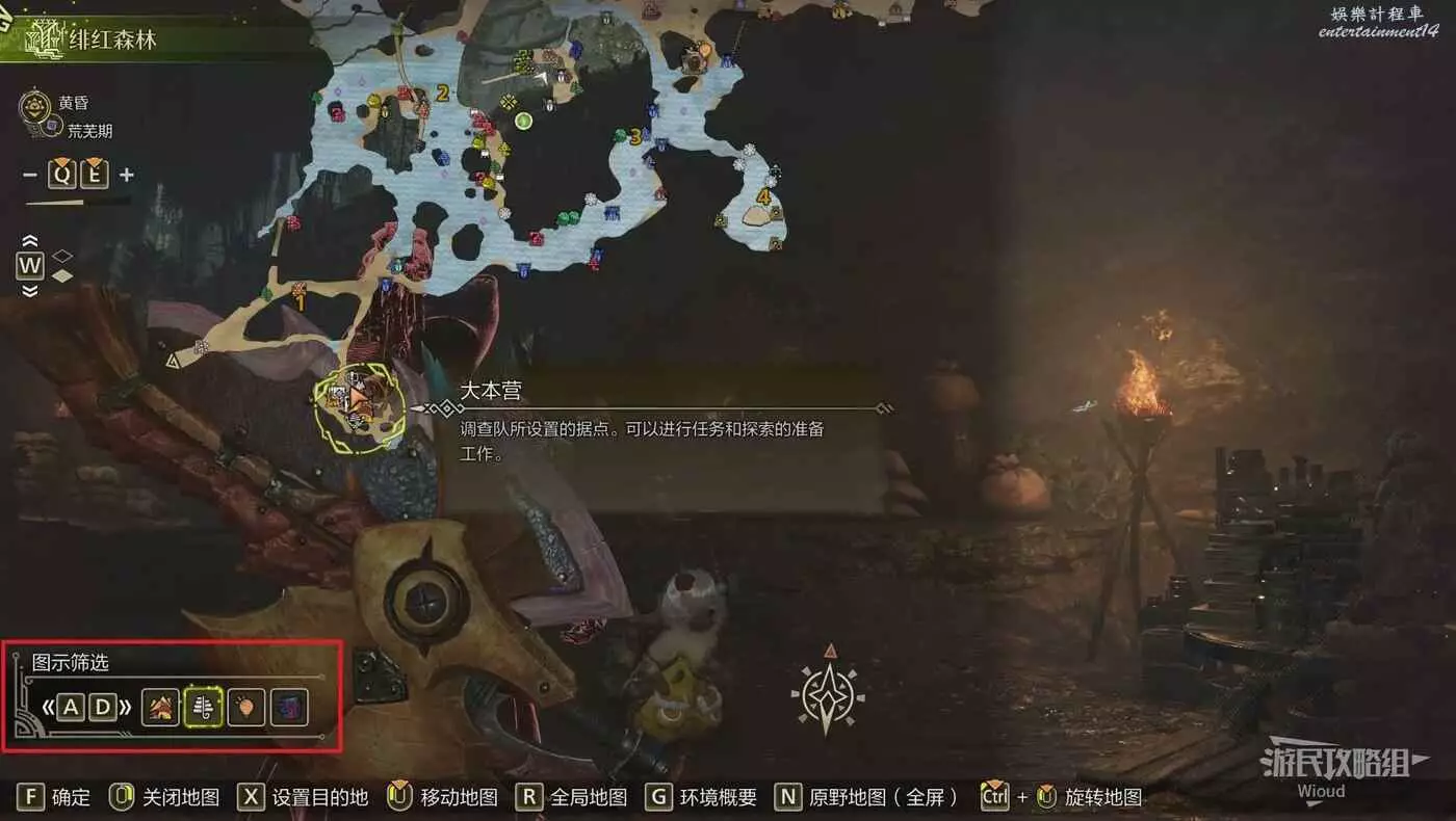 打開地圖,點擊左下角的圖示選擇【圖示篩選】即可看到此環境中出現的所有環境生物及素材。