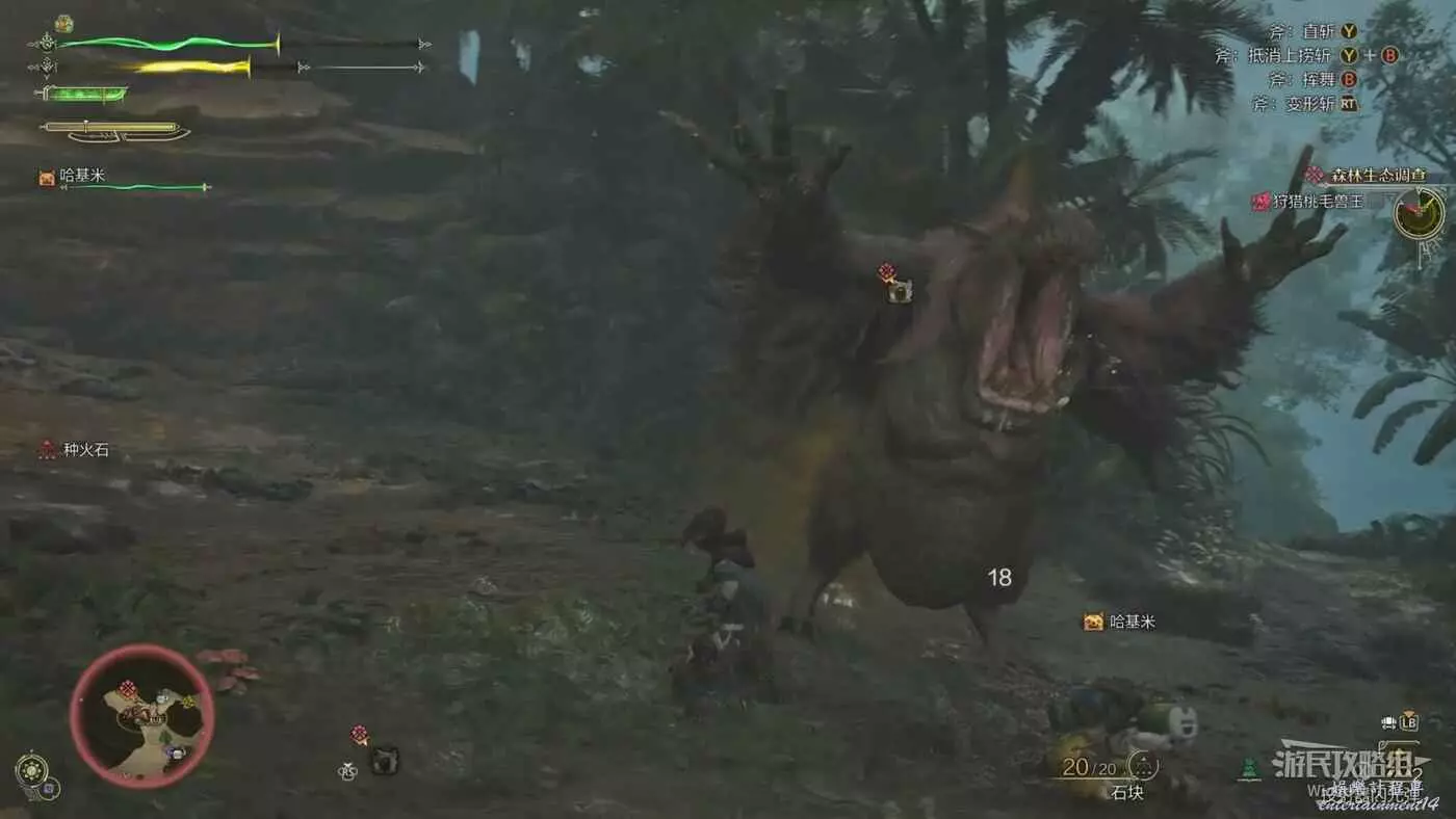 桃毛獸王換成站立姿態,邊吼叫邊張開雙爪,此時臀部也會開始放出大量黃色氣體,此招的兇險之處在於前搖與其他前撲招式極其相似,給予玩家誤導性。
