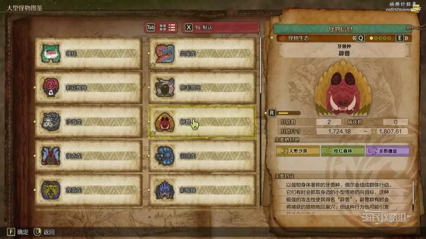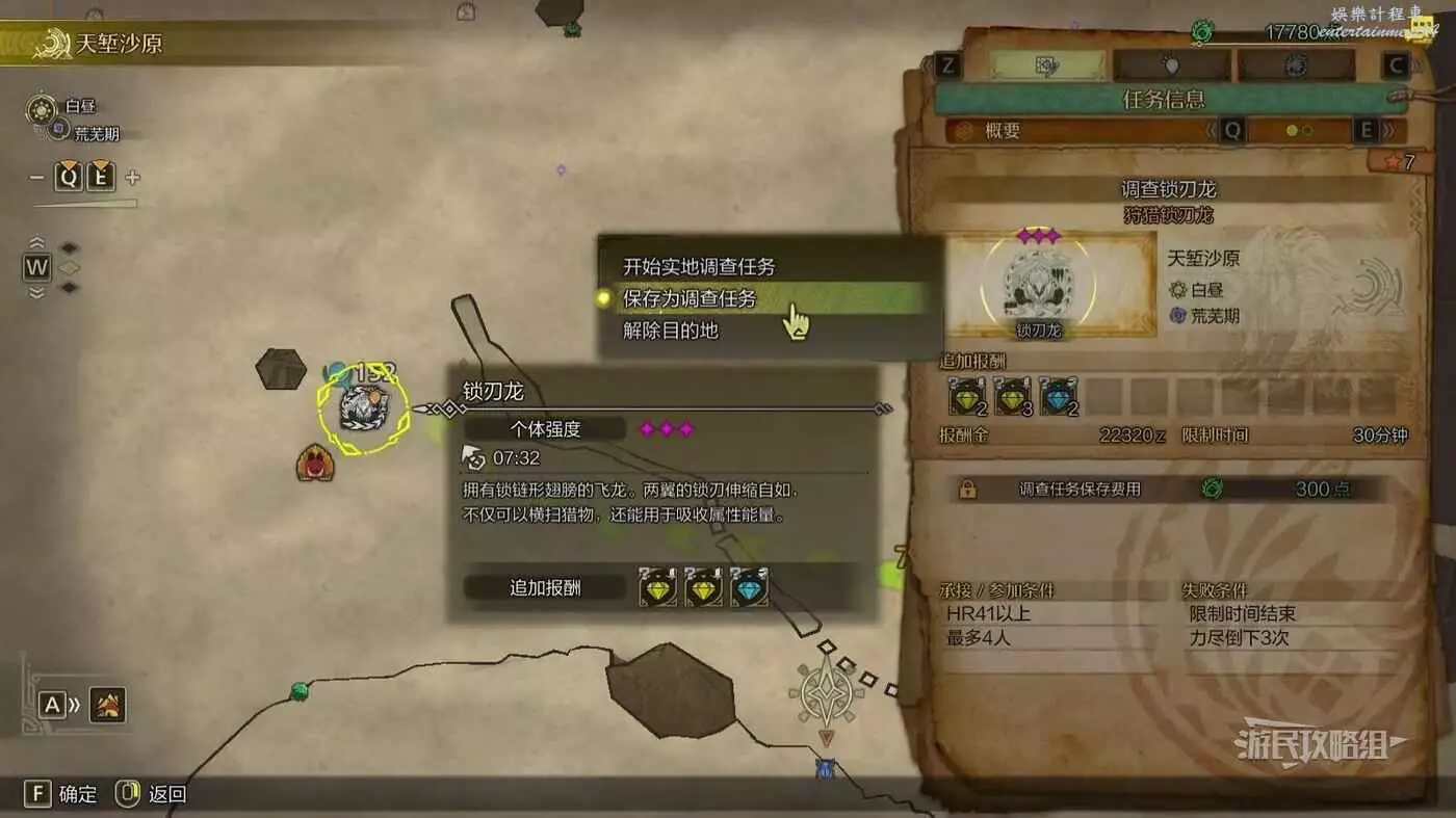 發現帶有金冠的怪物時可以按下【觸控板→□鍵】打開怪物清單,在目標金冠怪物處按【×鍵】將其保存為調查任務(最多可以保留50個),完成區域調查後也可以通過阿爾瑪查看近期遭遇的記錄並補存任務。