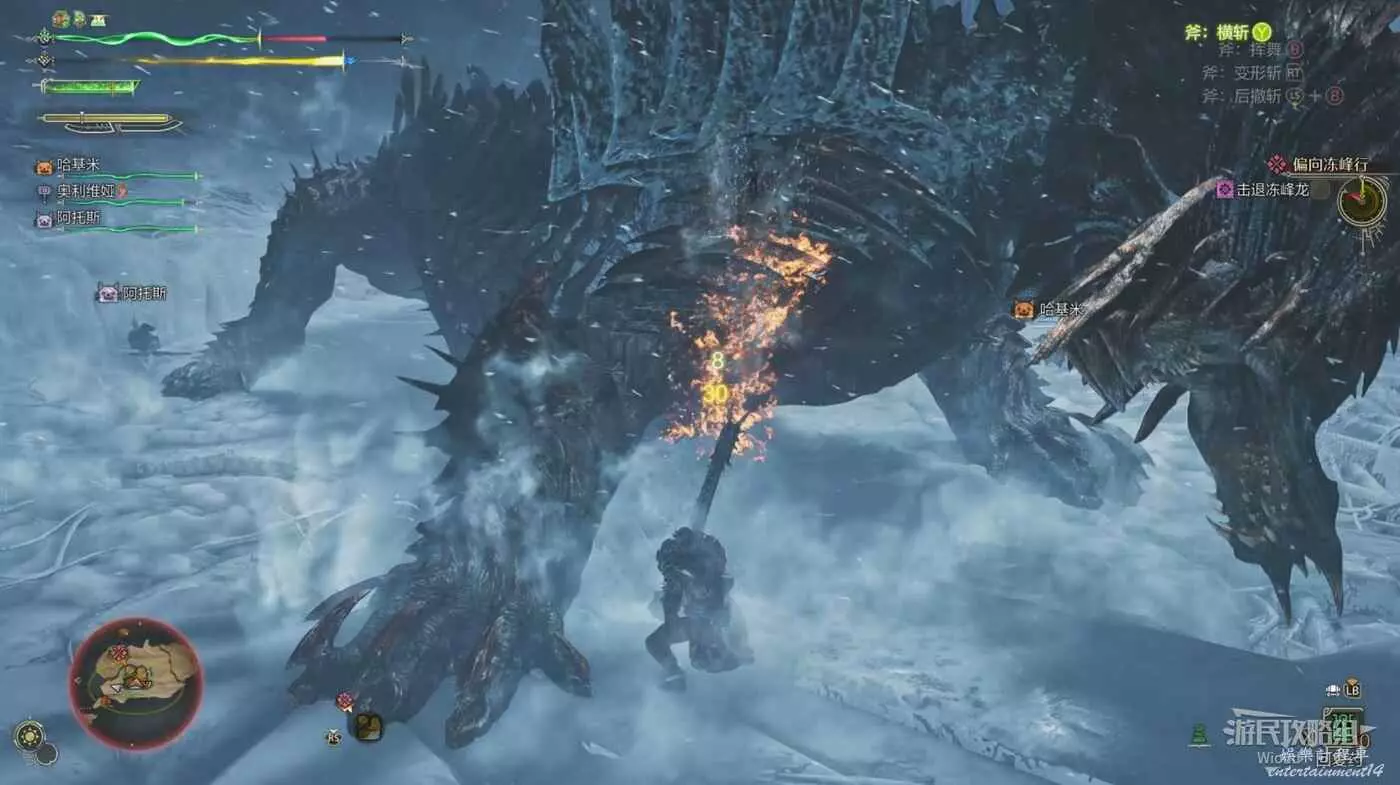 凍峰龍將爪子放置胸前,而爪子也會附上一層冰塊短暫蓄力後,朝爪子的一側直接拍打過去。