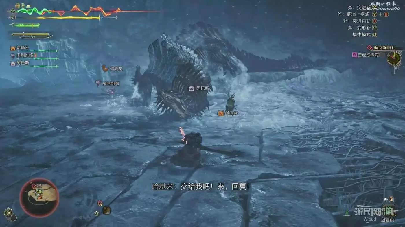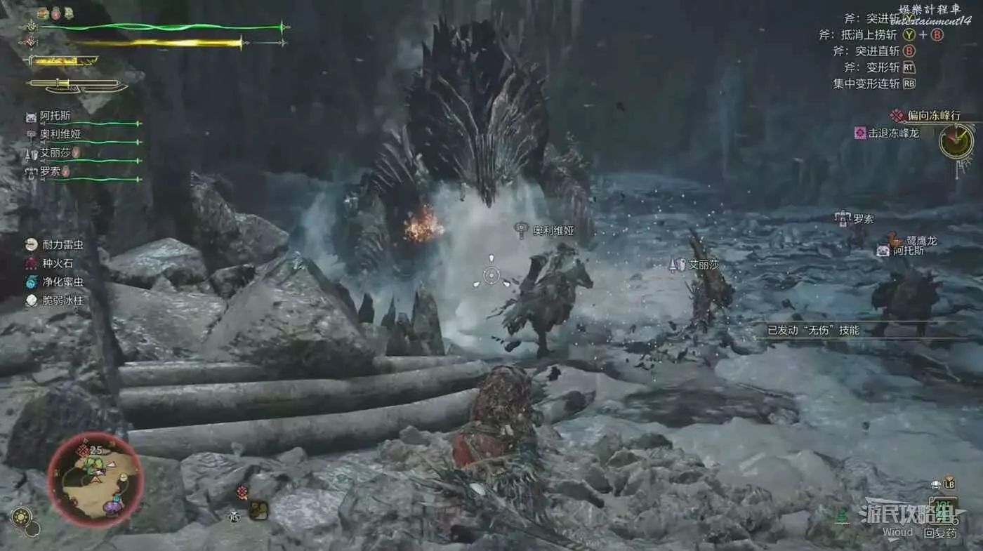凍峰龍的秒殺招式,原地短暫蓄力後,凍峰龍會用冰將自己包裹起來,此時場上也會出現岩石掩體,玩家需要躲在掩體後等待招式結束,如果蓄力結束還沒進入掩體那麼會被直接秒殺。