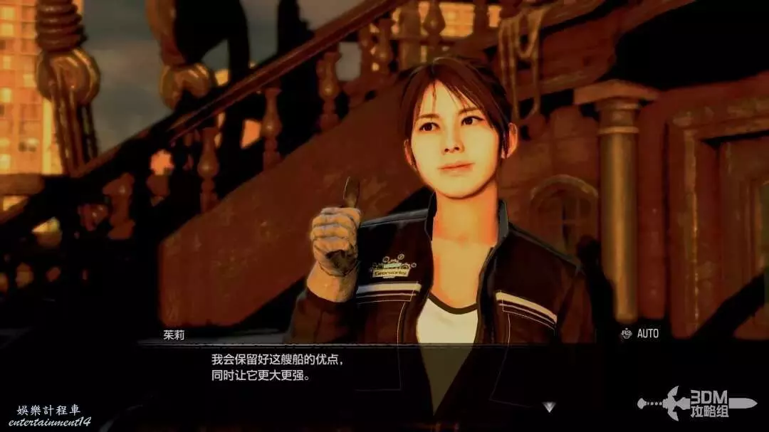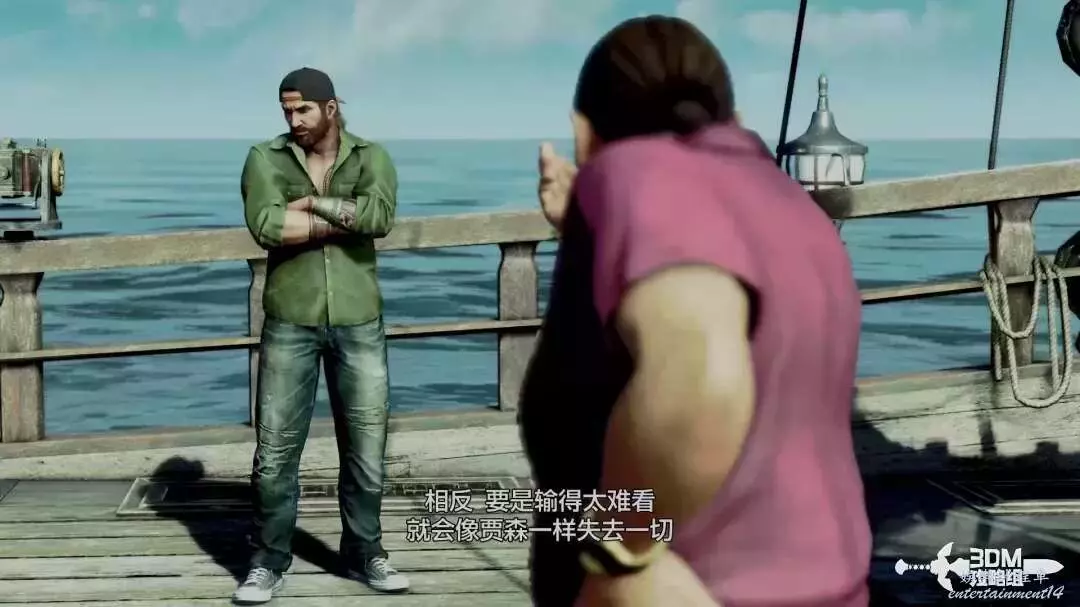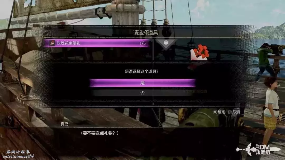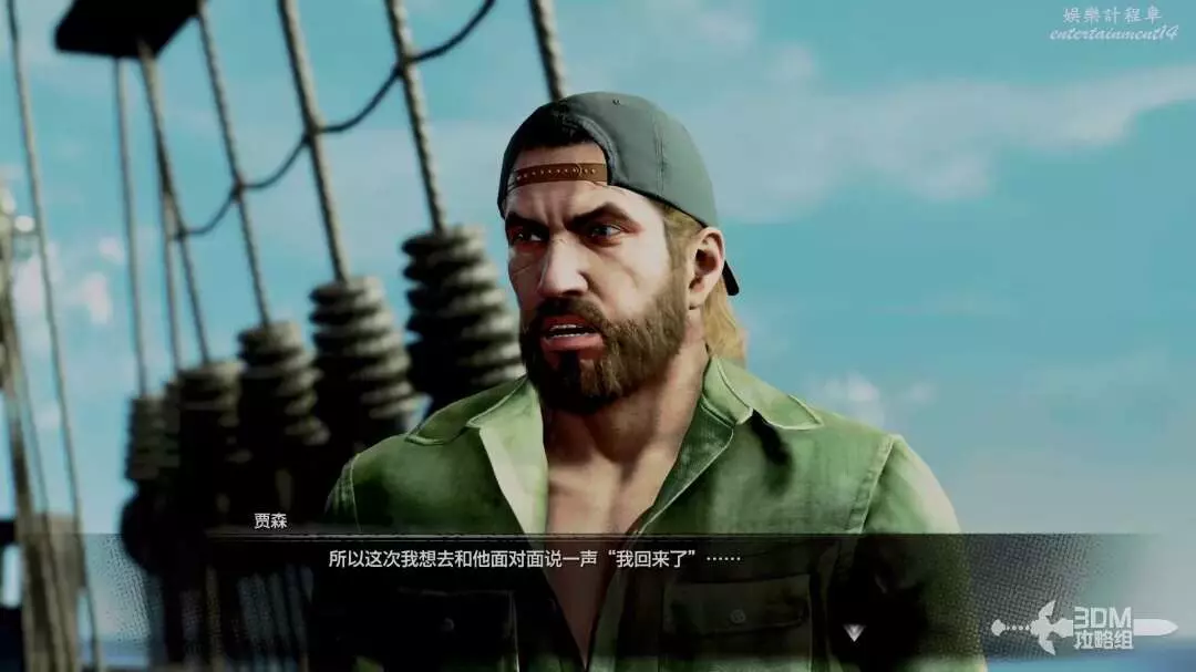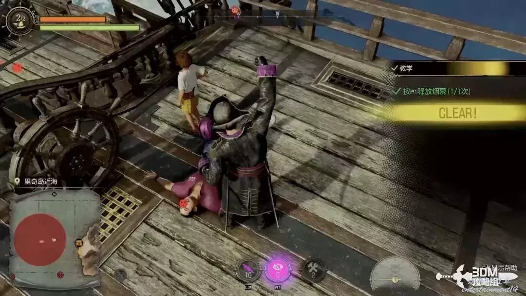 按方向下鍵進入甲板模式,這個時候就可以在船上自由活動,按右肩鍵R1釋放煙霧彈,然後救起阿勝。