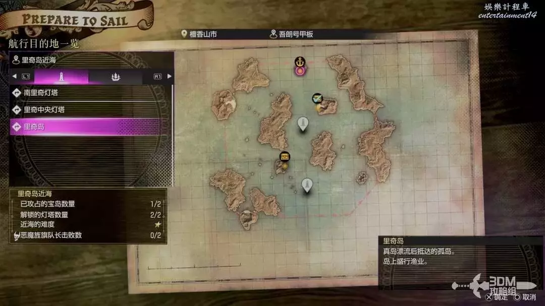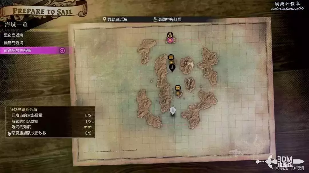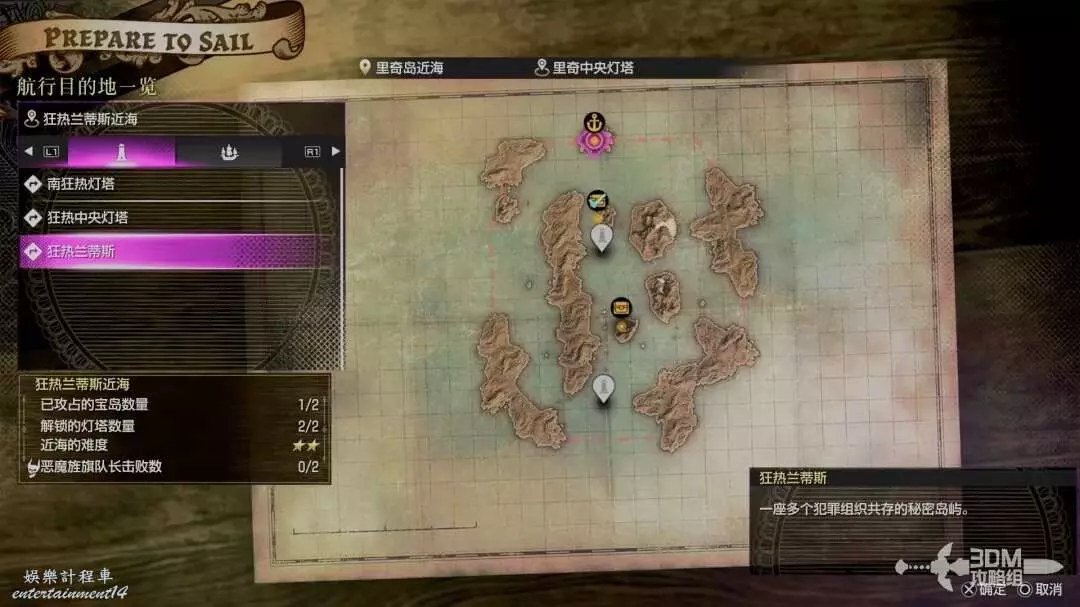 接下來就是將船開到狂熱蘭蒂斯了,在聶勒島整備好後,直接選擇前往狂熱蘭蒂斯。