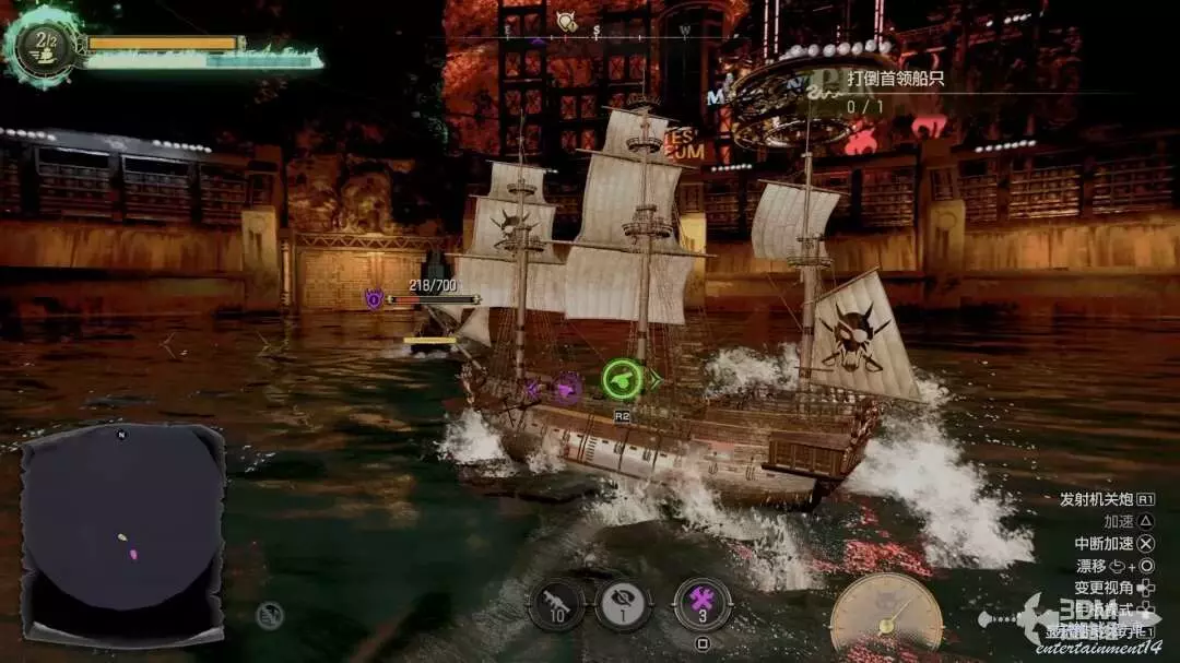 在駕駛船隻的時候,按□鍵可以修復船隻,不過每次海戰都只有兩次恢復機會(後面可以升級次數)需要前往燈塔處補給,才能恢復。按△可以加速船隻,然後左搖杆+○可以漂移。