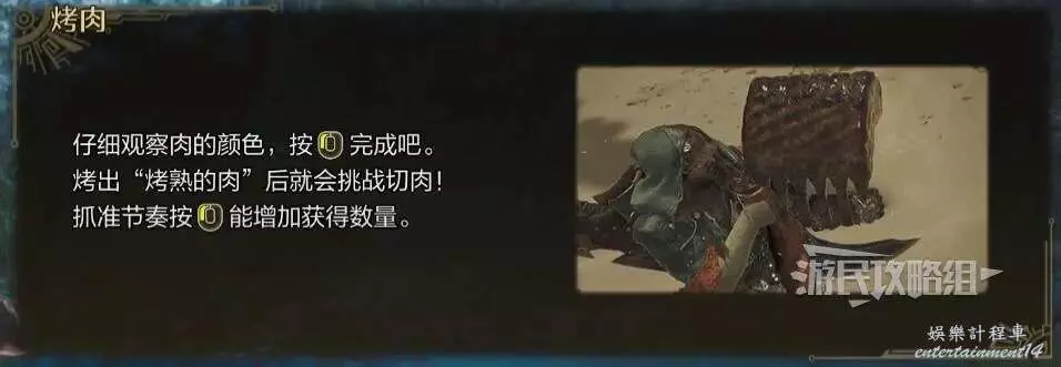 烤肉方法:裝備並使用便攜營火爐,選擇烤肉(需要消耗道具欄中的生肉,生肉可以通過狩獵小型怪物獲得),開始烤肉後,等待第一次翻面,然後再等候幾秒至肉變成烤好的顏色時按下【×/A鍵】,然後連續切割烤肉5次,如果每次能夠按照節奏精準切肉,可以獲得額外的烤肉獎勵。