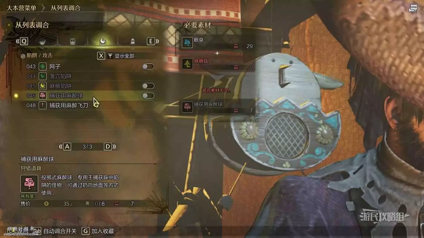 調合所需要的雷光蟲蓄電素、眠草和麻痹菇都可以在地圖標記處採集(騎乘狀態下打開地圖,按左下角提示按鍵篩選圖示,找到所需材料即可自動尋路),集齊之後傳送回營地即可製作。注意047捕獲用麻醉彈和048捕獲用麻醉飛刀也可以用於捕獲怪物。