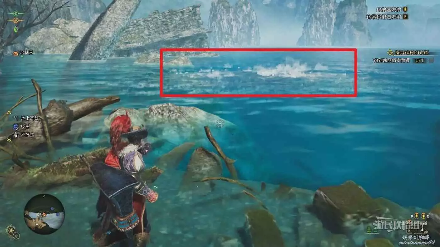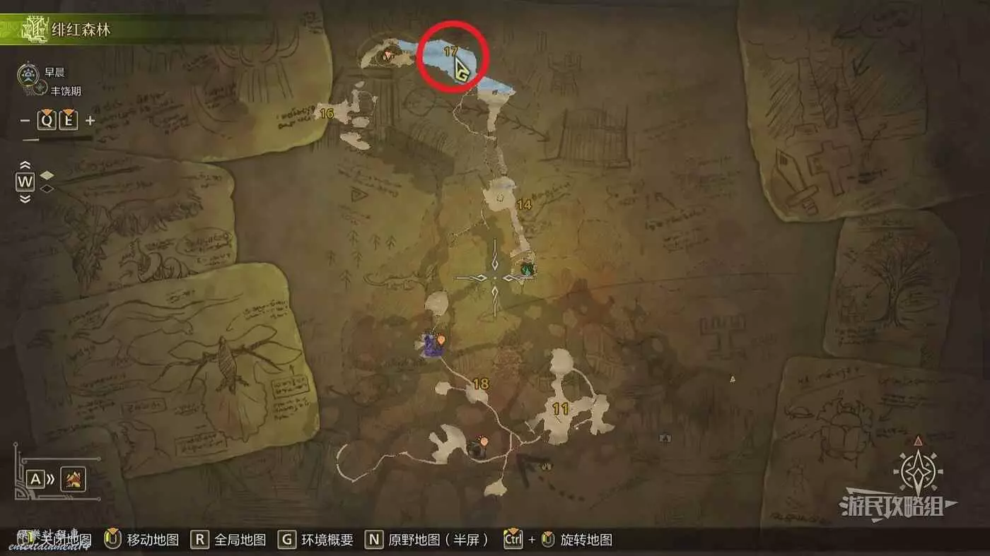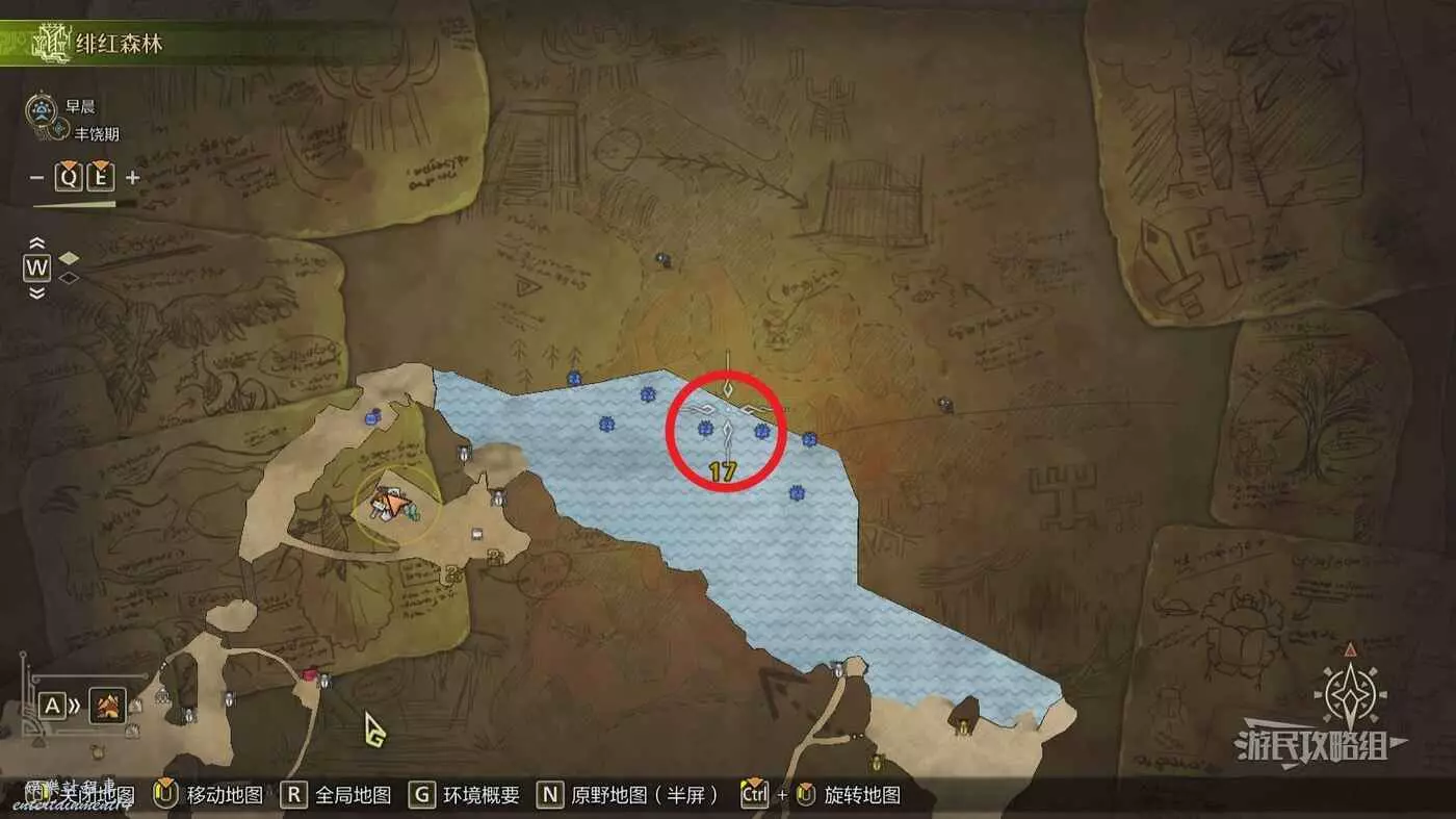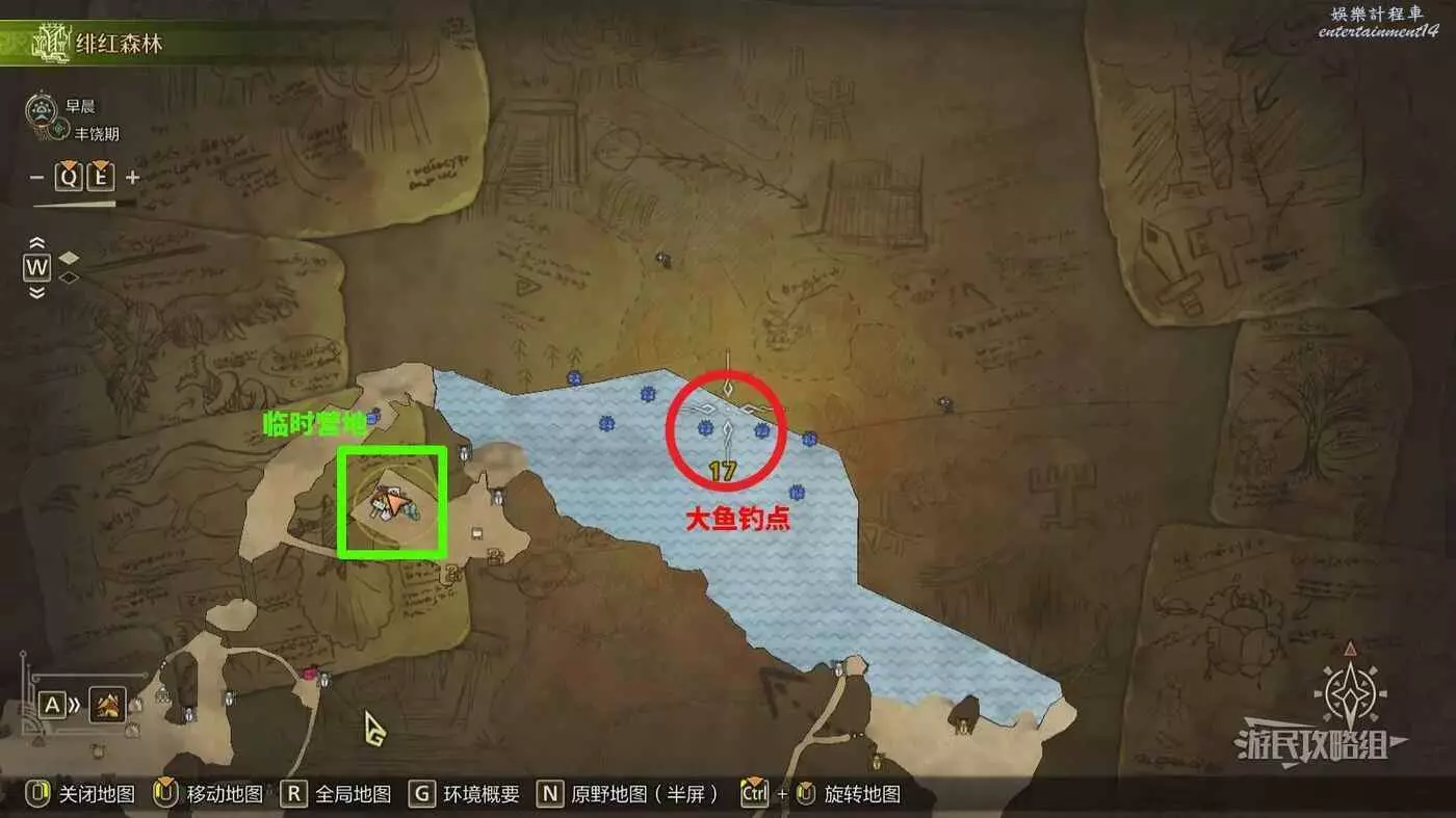 推薦釣大魚的位置在【緋紅森林(上層)區域17】的巨大湖泊(瀑布對面的湖泊深處),具體位置請參考下圖。