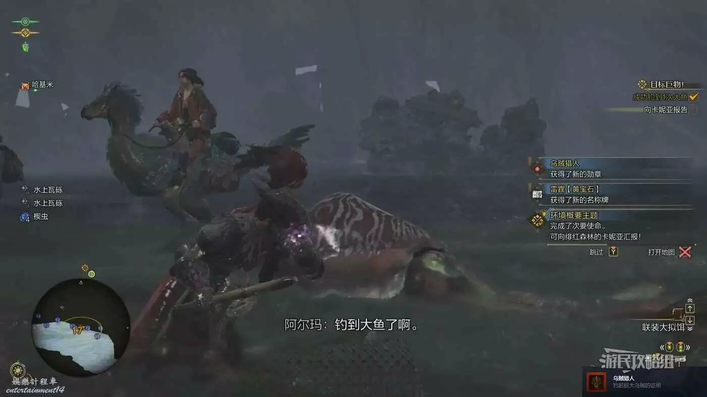 釣大魚時,先選擇魚餌拋竿,如果沒有魚上鉤也可以根據按鍵提示的蕩竿鍵來引誘大魚咬鉤,等咬鉤之後,順著大魚遊動的方向移動釣竿(左搖杆/WAD鍵),等魚遊累了的時候交替扳動左搖杆上-下收線(PC端交替按W/S鍵收線,獵人會有明顯的挑起釣竿的動作),重複這個步驟3-4次,直到大魚靠岸即可成功釣上。