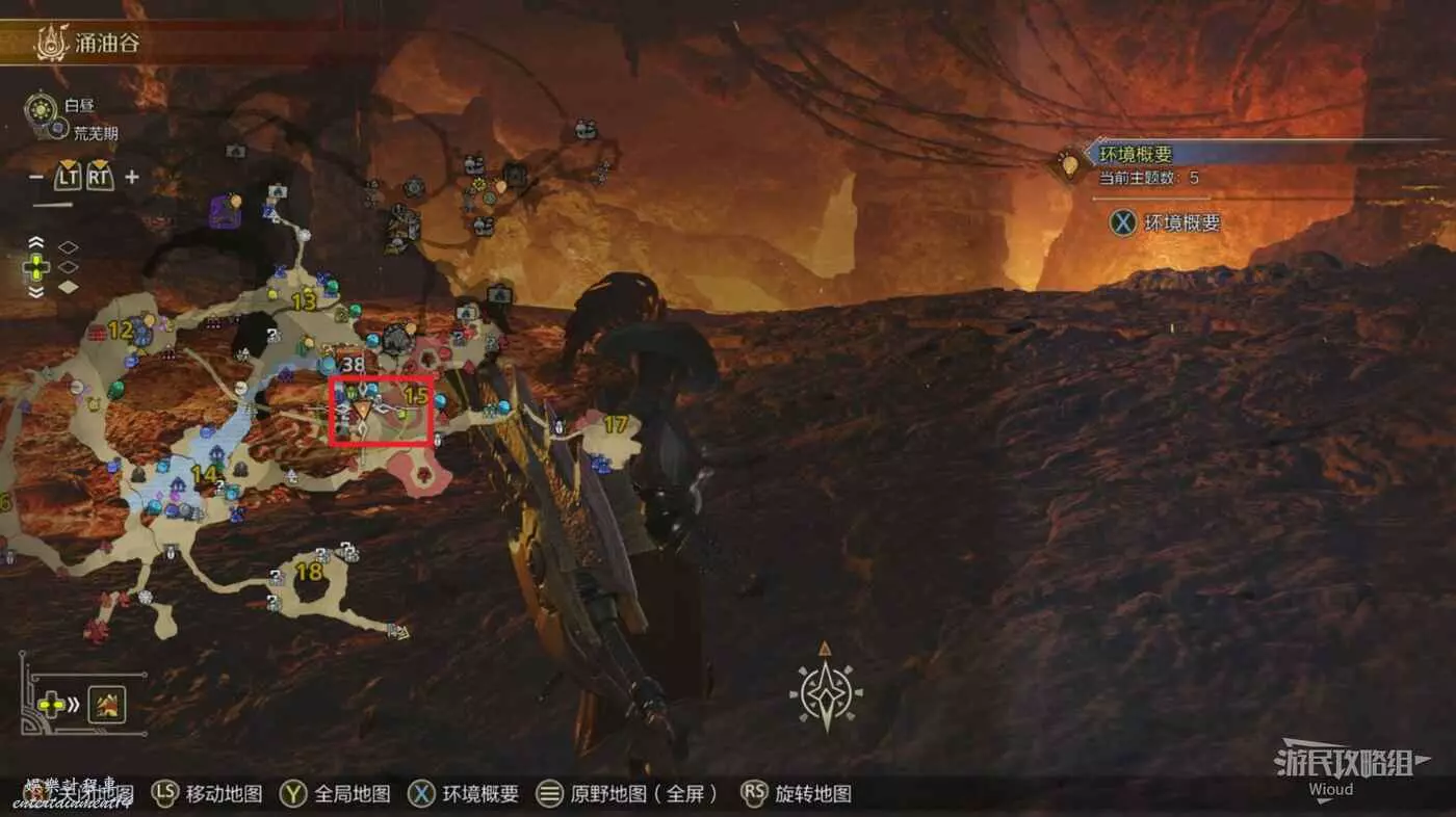 傳送到湧油穀區域的最下層,移動到下圖紅框所選區域處,這裡被岩漿覆蓋,是火焰蜥蜴出沒概率較高的區域。