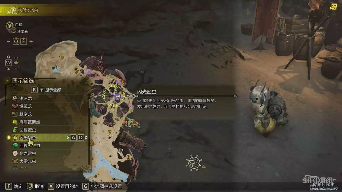 需要完成前置任務【強力回復支援】,然後回到營地與貓對話接取,直接打開地圖圖示篩選出閃光翅蟲的位置。