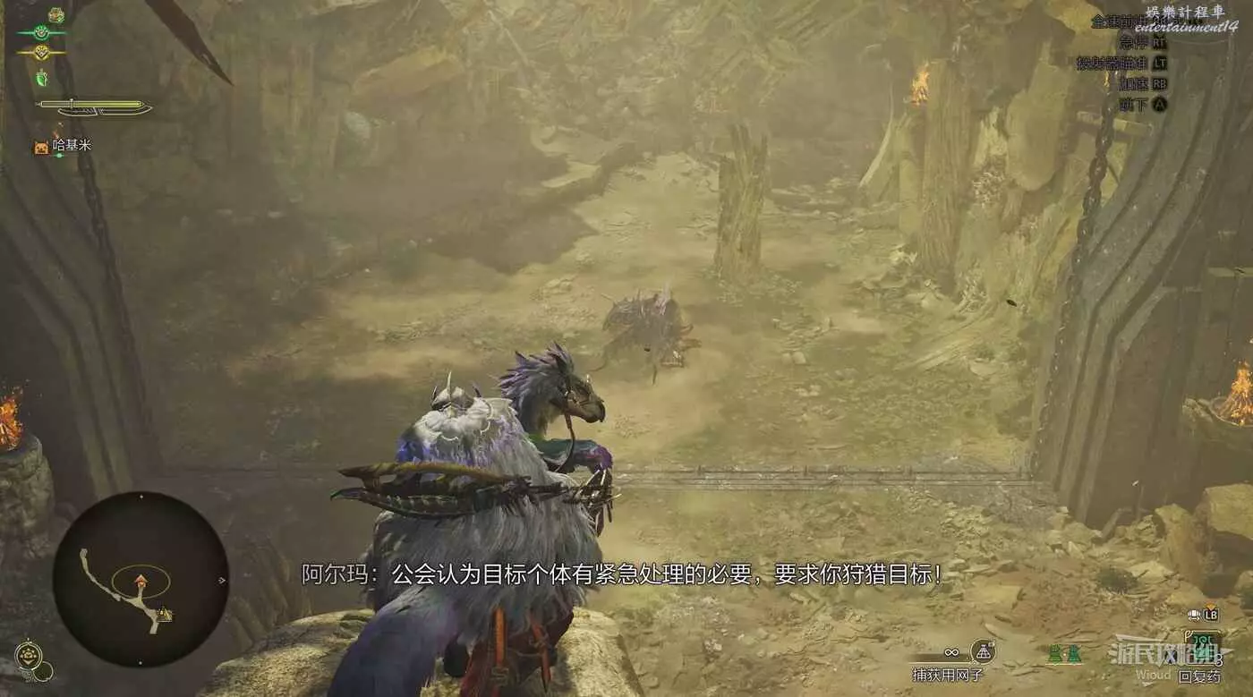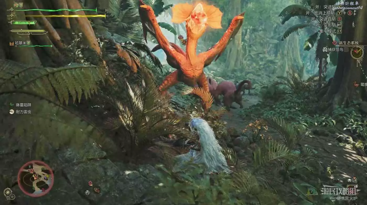 當怪鳥殘血時,它會再次轉到任務剛開始的高臺處,因此這也是判斷是否到達捕獲階段的標準,當然還是需要查看怪鳥最後一次轉區時的行動狀態,先放著一個捕獲用麻醉陷阱將其困住。