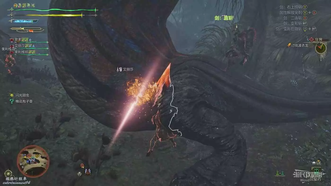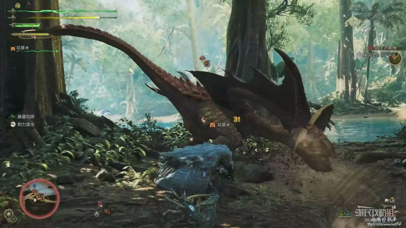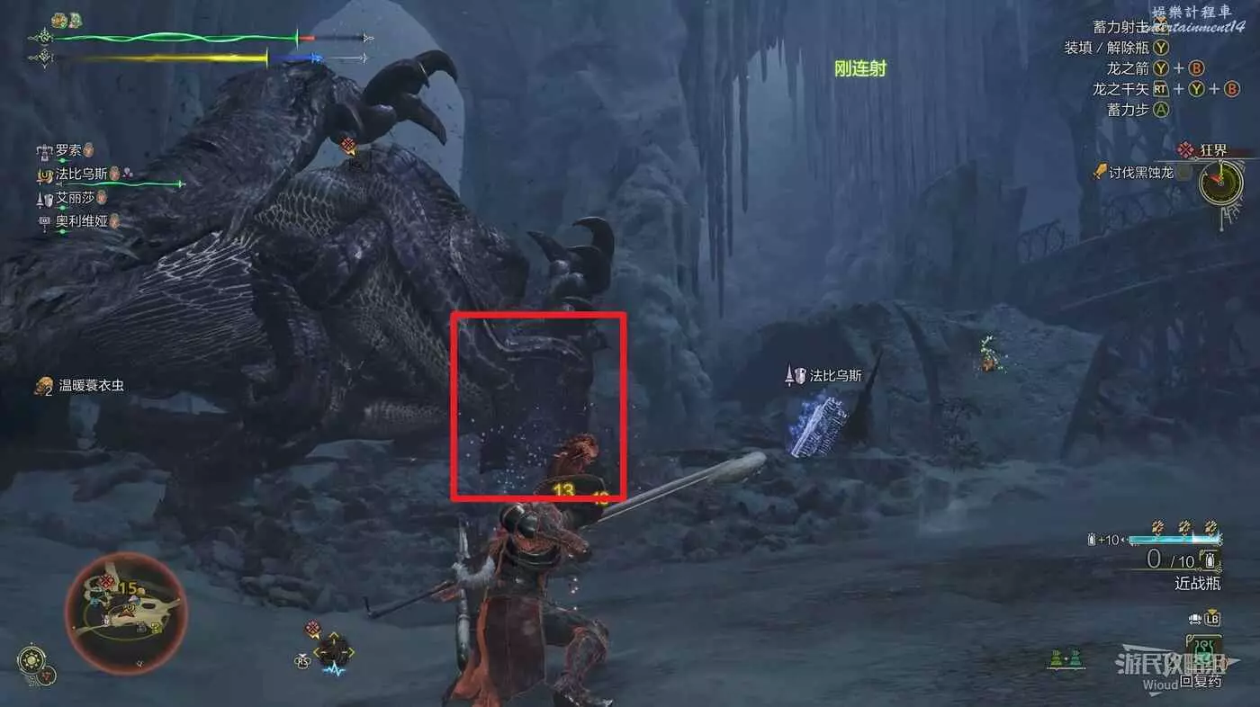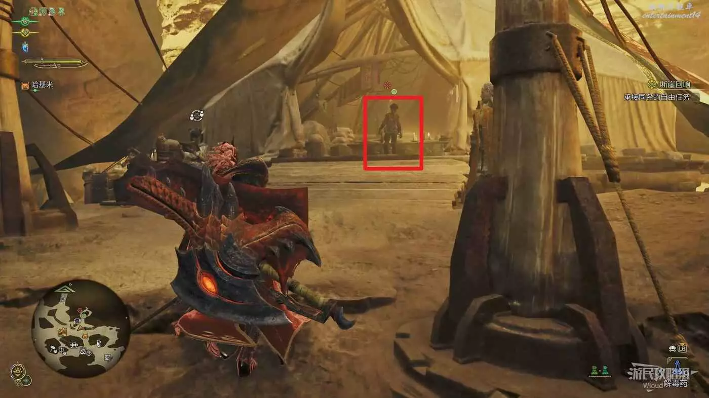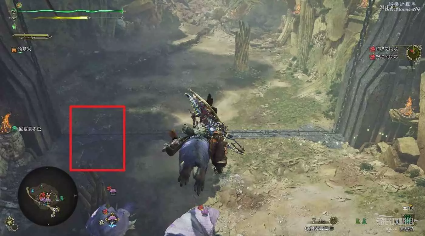 下圖紅框處有兩個機關,與其互動可以將競技場一分為二,避免同時與兩隻風鋏龍戰鬥。
