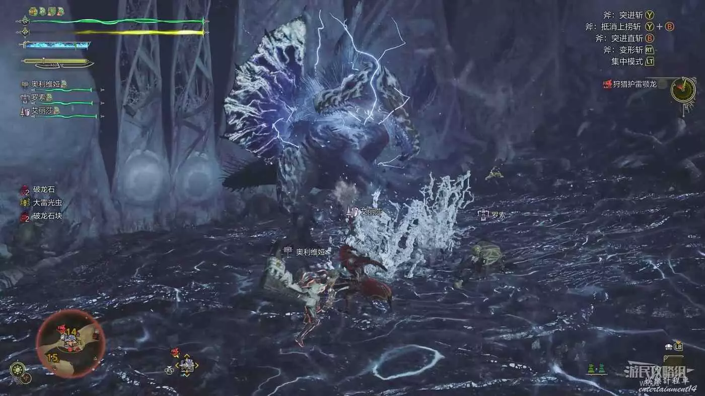 護雷顎龍降低重心,並對目標張開大嘴直接啃咬過去,中間有一段小衝刺並造成範圍雷擊。